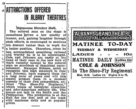 Bob Cole, Rosamond Johnson, and James Weldon Johnson wrote The Shoo-Fly Regiment. For several nights, the musical comedy came to Albany to the Harmanous Bleecker Hall in 1907. It was not the first time Rosamond or Bob Cole performed in Albany. They had taken the two-person show of Cole and Johnson to Albany a year prior. Cole and Johnson’s brothers had a successful history working together, writing and performing vaudeville acts, and traveling across the US, London, and Paris.