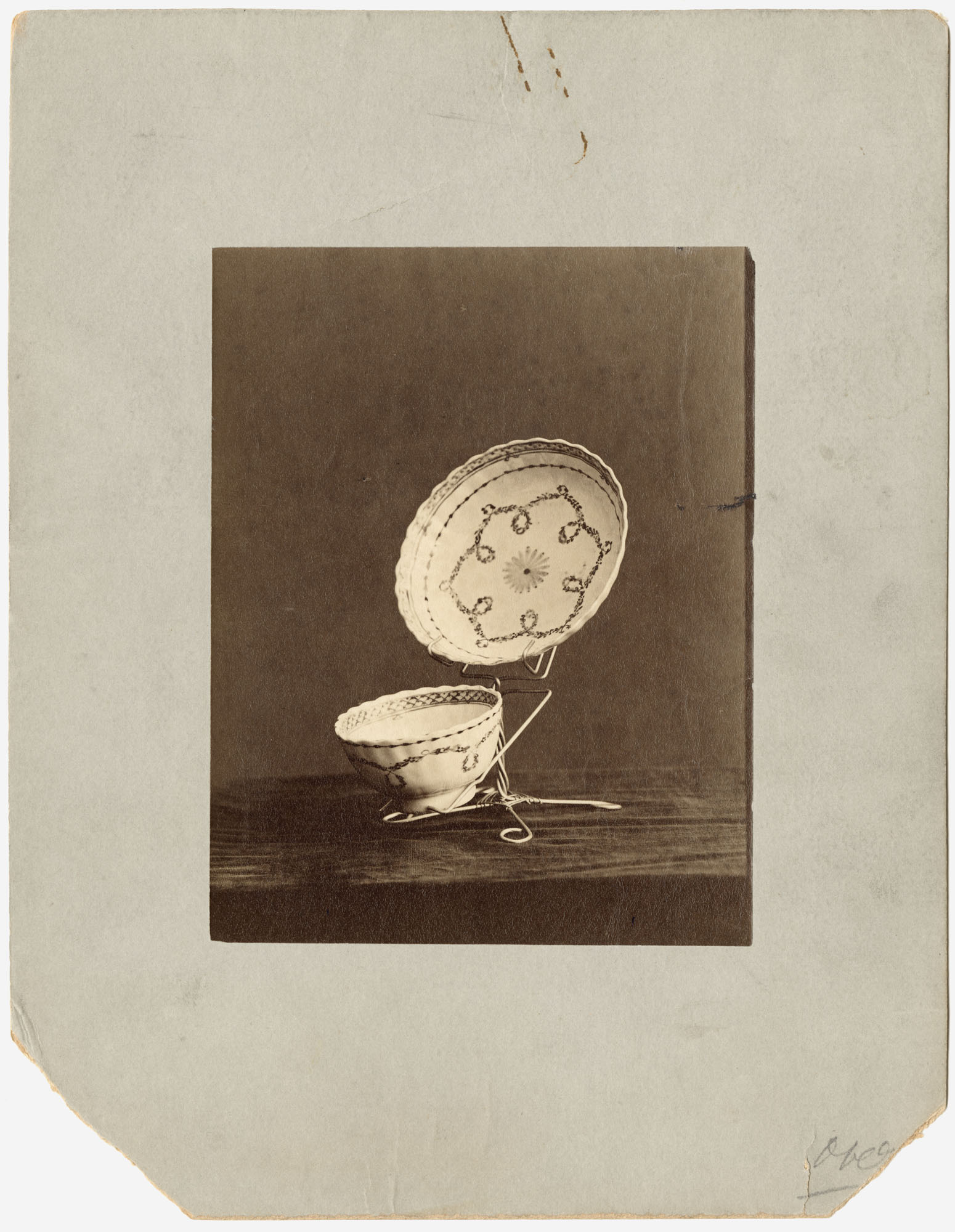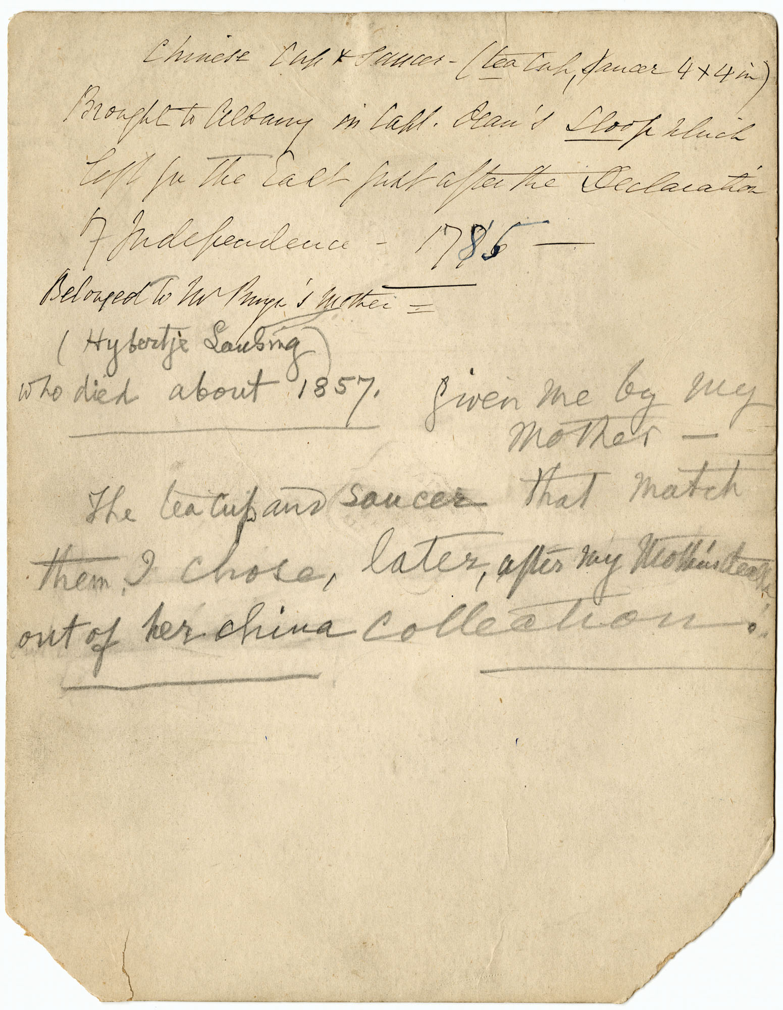 Inscribed in black ink, in script, on paper label attached to bottom of saucer: Chinese / porcelain / Brought by Captain Dean / 1777 (sic) 217 / 218