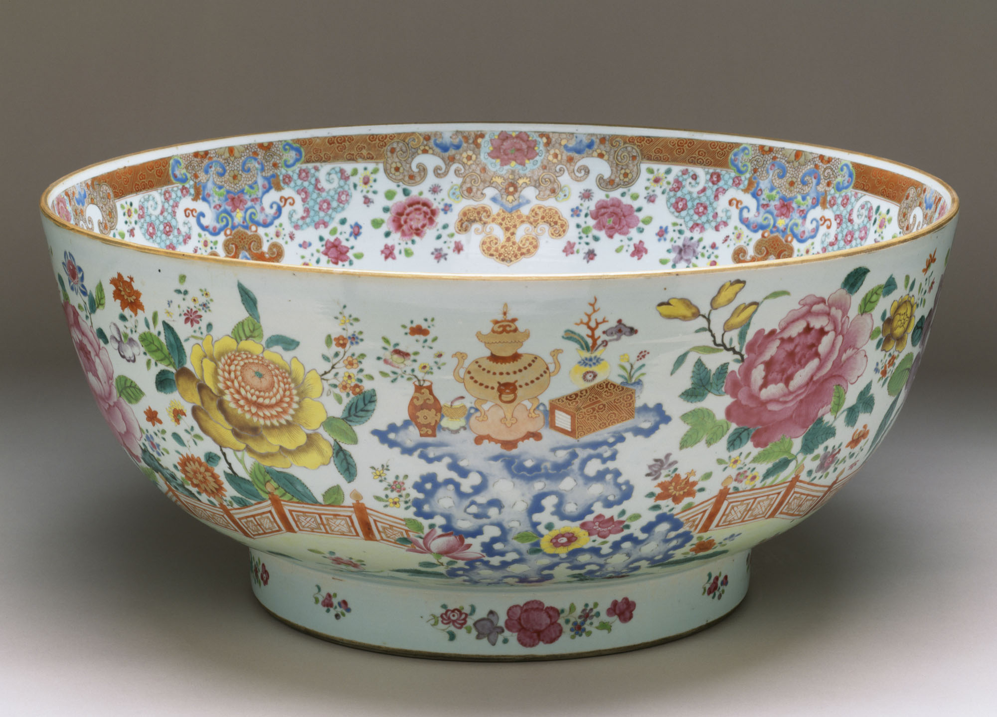 This massive punch bowl is decorated in rose- palette enamels with a bold floral pattern of long clusters of leafy tree peonies issuing from behind a fence. On top of the irregular rock is a collection of antiquities relating to Buddhism. Punch bowls were not part of the ordinary dinner ware exported from China to the U.S., but would be ordered individually. They were used extensively, before and after meals and for used for special celebrations, to hold hot or cold drinks.