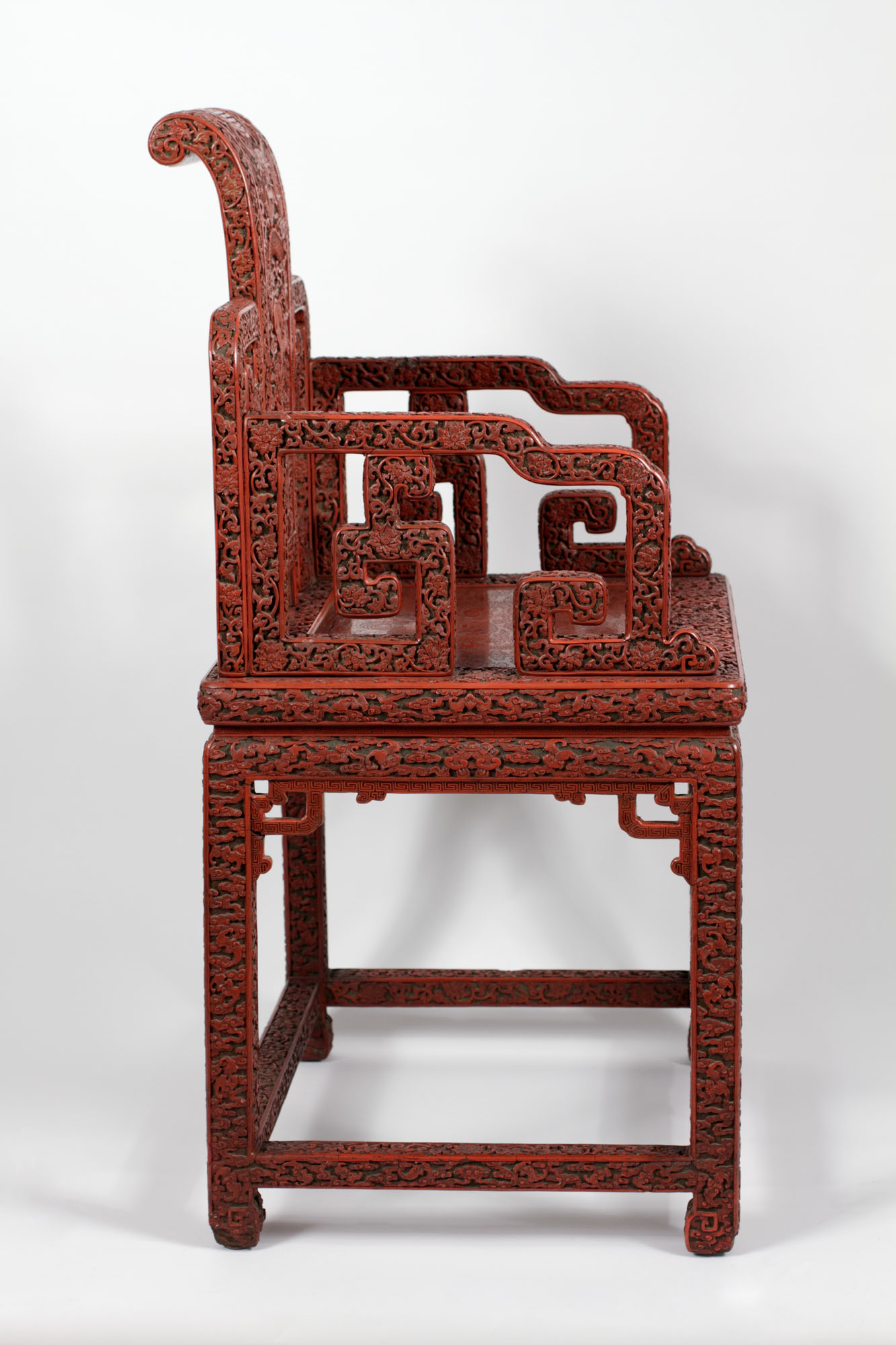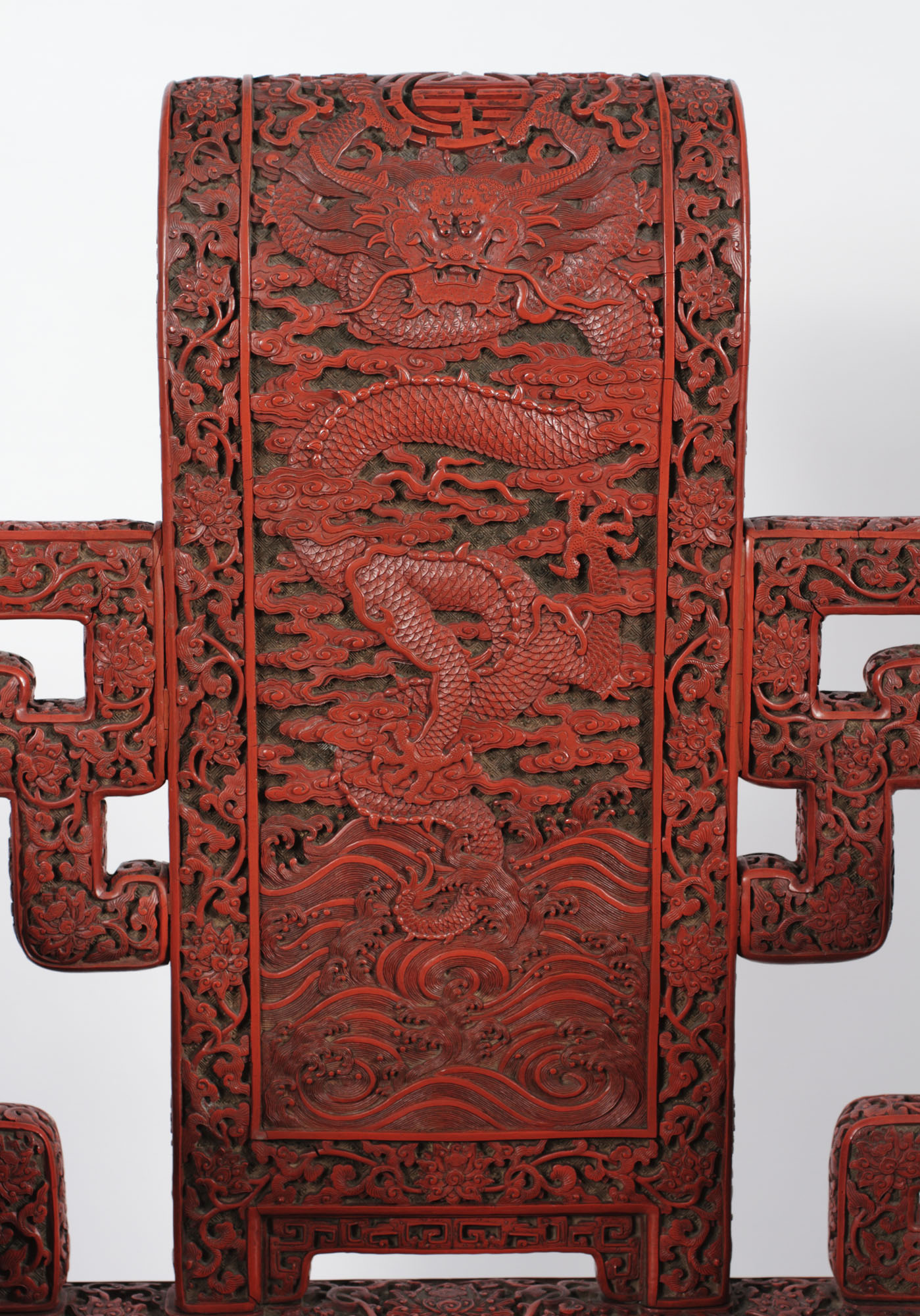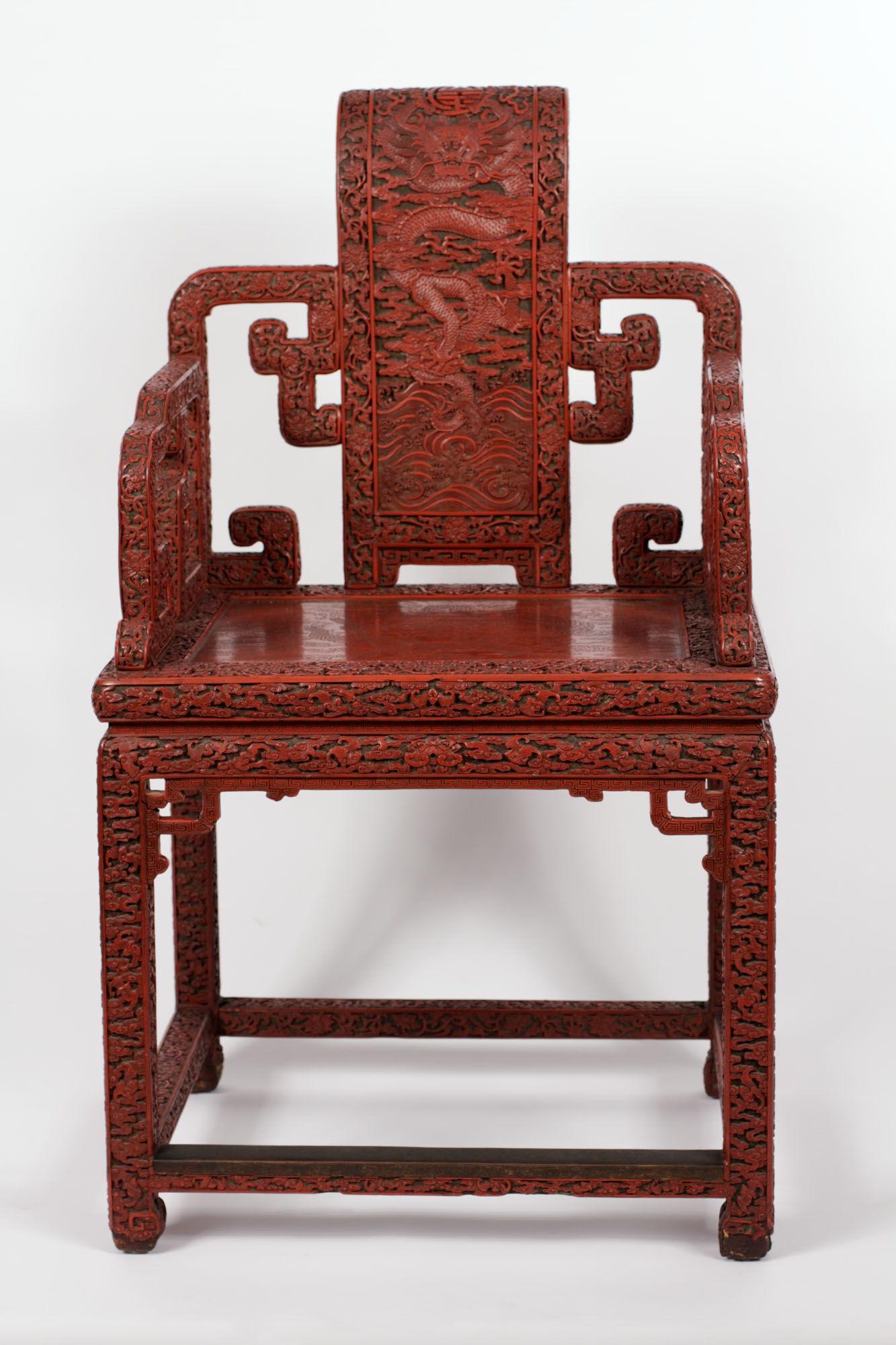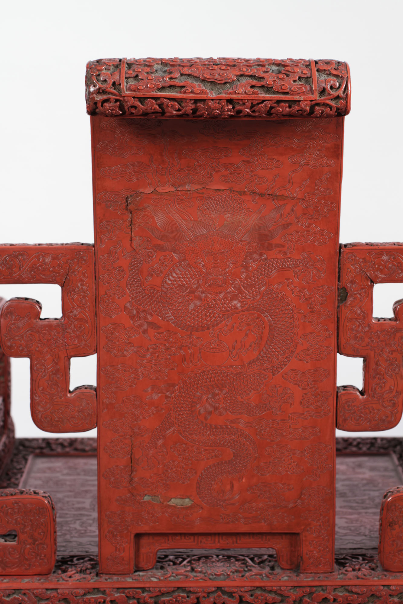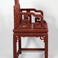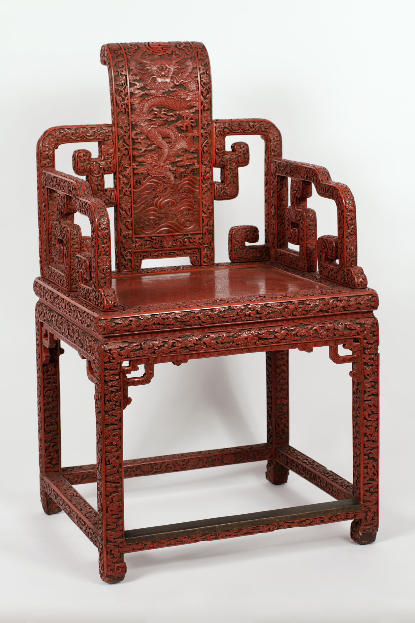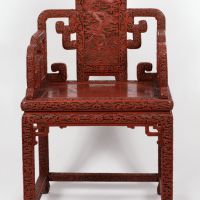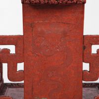 The five-toed dragons carved into the back and seat of this chair indicate it was made for Emperor Qianlong since only emperors could display dragons with five toes. According to its history, the chair came from the New Imperial Summer Palace, built in the 1750s by Qianlong on the western edge of Beijing, where it still stands today. This chair and at least two others were taken from the palace in 1900 during the Boxer Rebellion.