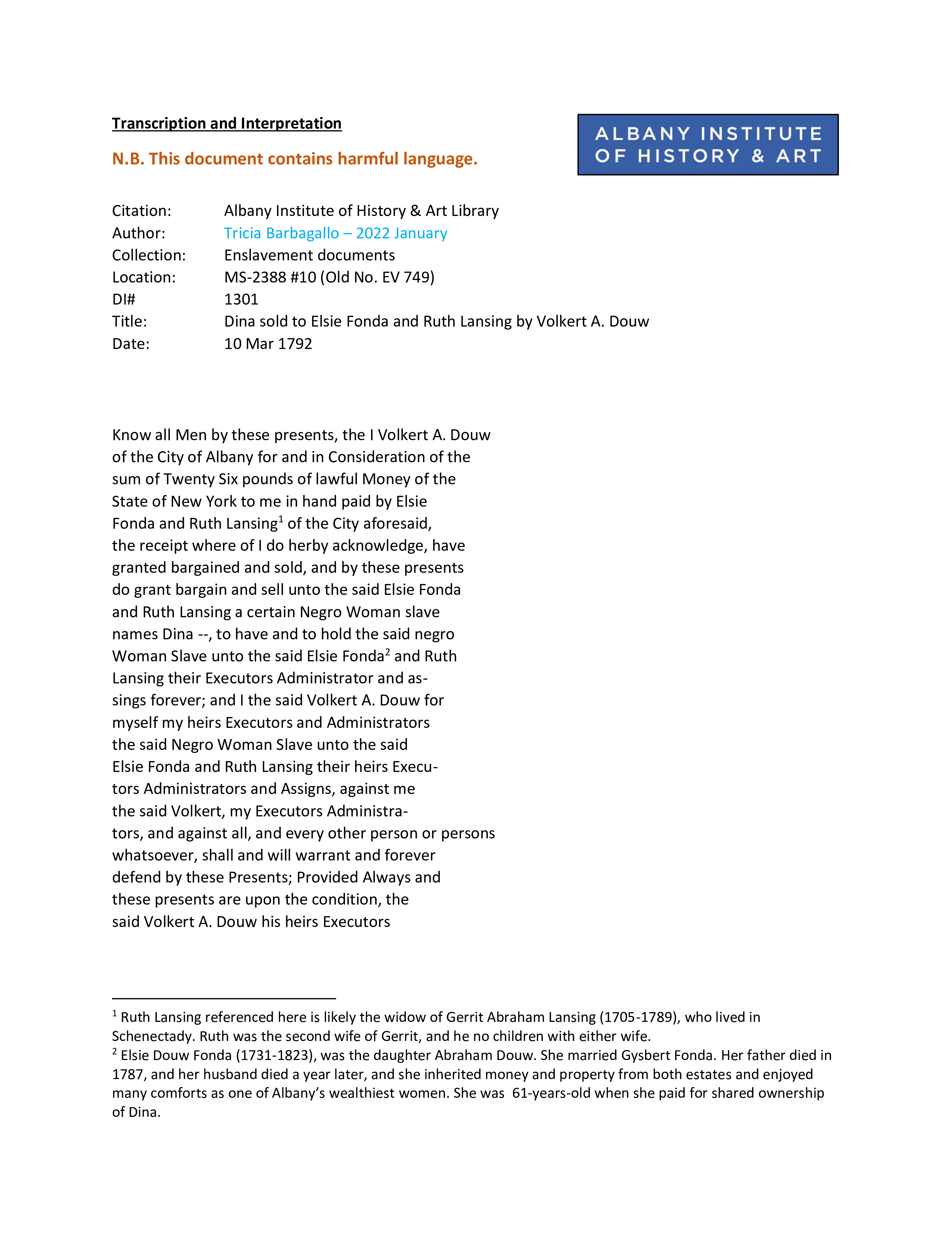 Dina - 1792 enslaved by Volkert Douw, sold