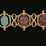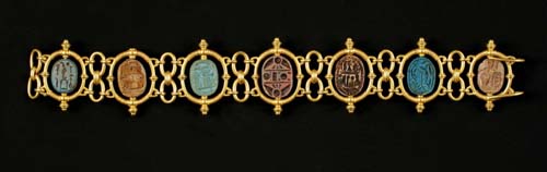 Architects, furniture designers, and jewelers used Egyptian motifs and frequently grafted Egyptian design elements onto contemporary forms. This bracelet combines two revival styles: the gold loops and rings imitate ancient Etruscan forms, while the glazed steatite scarab beetles copy ancient Egyptian models. Ancient Egyptians revered scarab beetles. The beetle's habit of rolling spheres of dung across the ground reminded Egyptians of the sun's movement across the sky, performed by the deity Re. Scarabs, therefore, became sacred symbols in ancient Egypt and, during the nineteenth century, popular design elements in Egyptian revival jewelry.