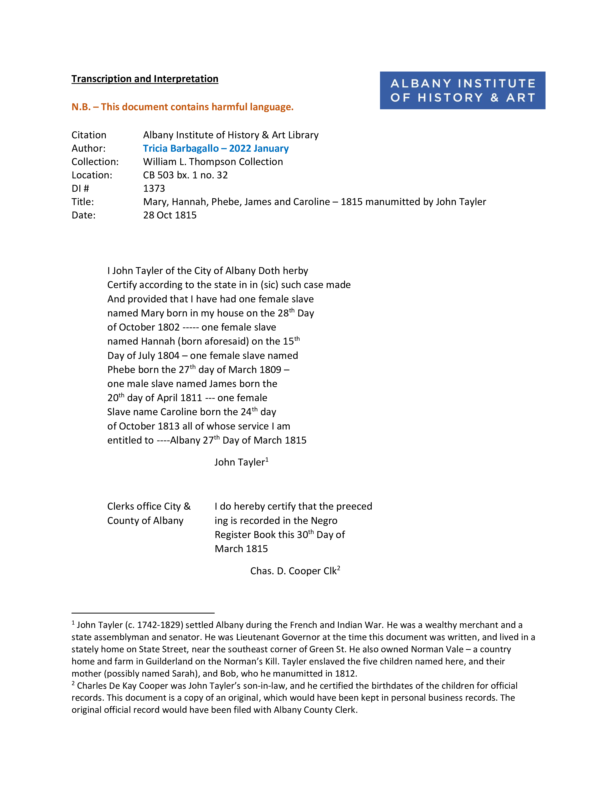Mary, Hannah, Phebe, James and Caroline - 1815 emancipated by John Tayler