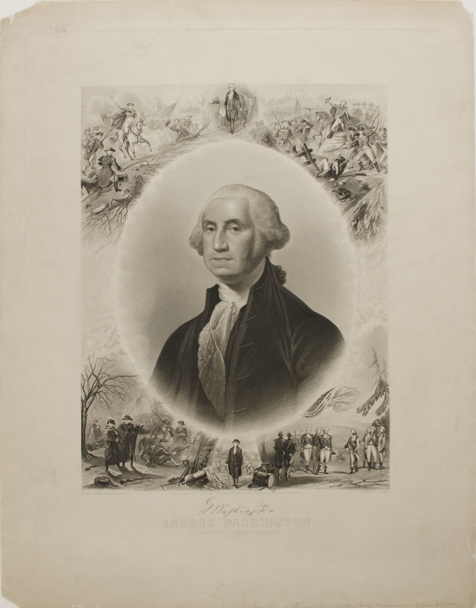 The four corner vignettes of this print depict Washington’s most significant military battles and victories of the American Revolution: Trenton, Princeton, Valley Forge, and the Surrender of Cornwallis at Yorktown. The upper center figure shows Washington as President, while the bottom center figure represents him as plantation owner. Although Washington accomplished many other important deeds throughout his life, images like those on this print reinforced popular perceptions of the man as great military leader, selfless public official, and humble private citizen.