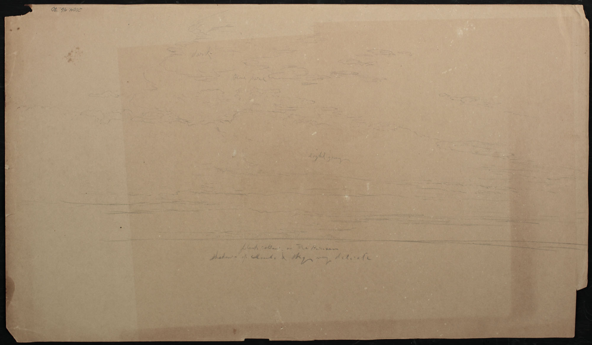 Reverse side shows a pencil sketch of sky and clouds with color notations.
