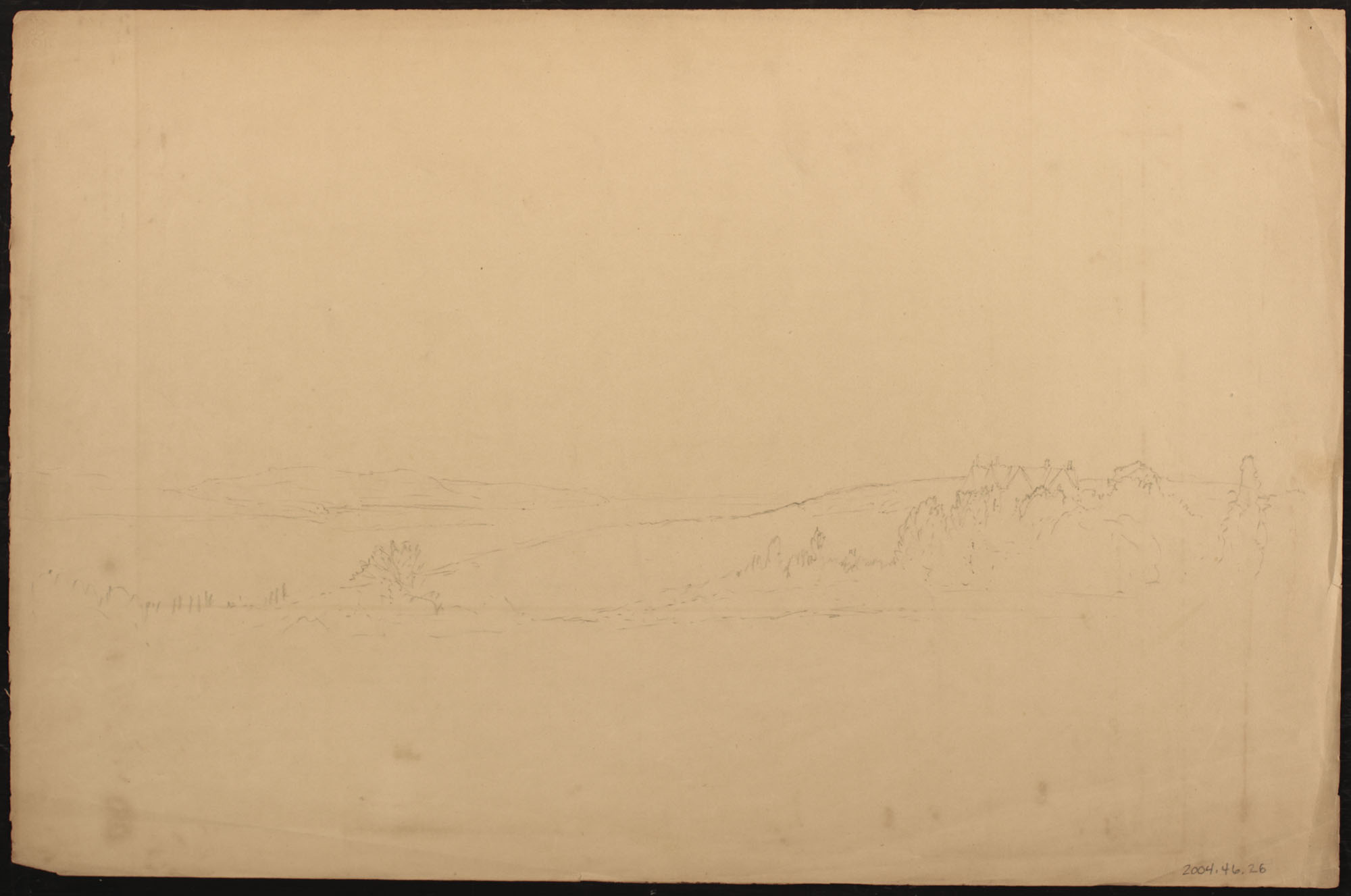Pencil sketch on reverse shows the Hudson River on the left and on the right the steep gables of a house set on a wooded hillside overlooking the river.