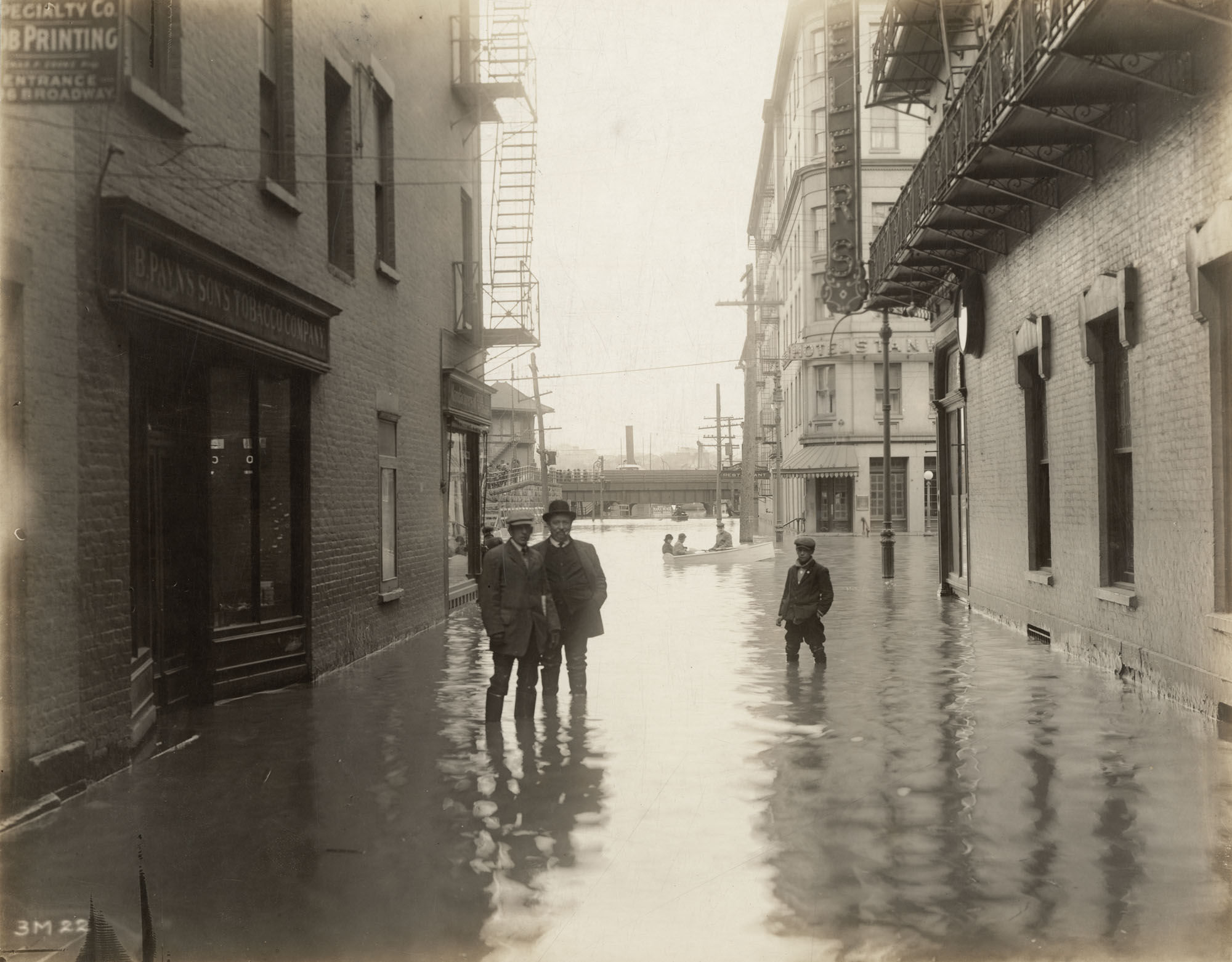 Inscribed in ink on back: "Mar 28-1913-/ High water-/Maiden Lane & Broadway-/look east from James St."
