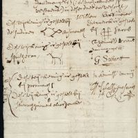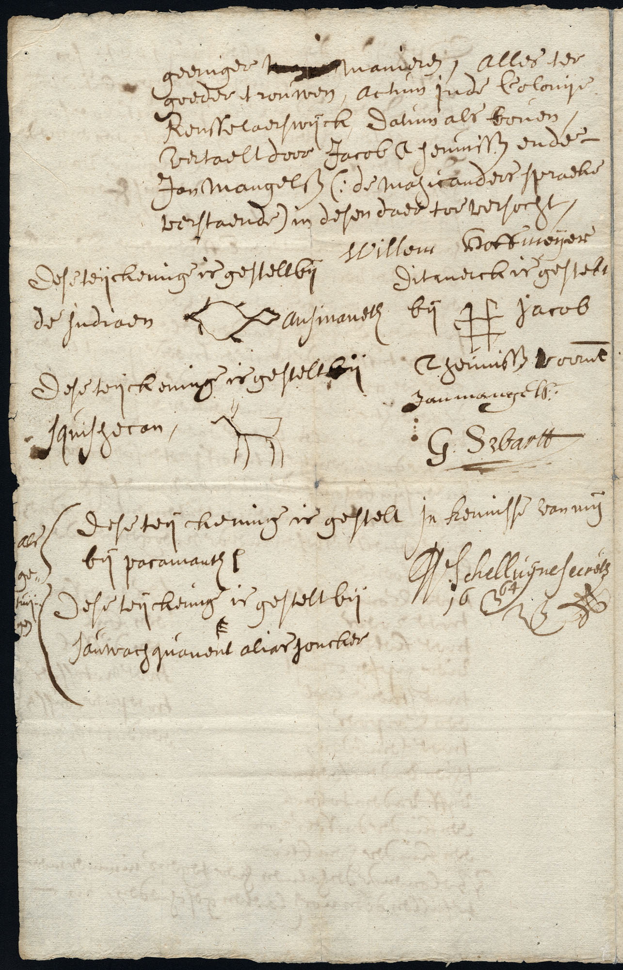 To-day, the last of May 1664, Willem Hoffmeyer bought with the approbation of the honble Director of the Colony of Rensselaerwyck for the behoof of the Lord Patroon and his Co-Director of said Colony from the Indians Ansinaneth and Squischecan, Mahicanders, acting for themselves and for their blood relations and heirs, who acknowledge to have sold and conveyed herewith as absolute, free property certain three islands in the North river between the first and second Spruyt, opposite the Green Island, with all privileges, preeminences and prerogatives thereof and all appendices and dependencies thereto belonging, without reserving for themselves any claim or pretension whatever thereto: for which they, the grantors, acknowledge to have been fully and satisfactorily paid by the following goods: Two rugs, two muskets, two kettles, four handfuls of powder, two bars of lead, one fur cap, two shirts, ten strings of wampum, five strings of tobacco, one child's coat of duffels, one child's shirt, six knives, one hatchet, one adze, two pouches, two p. of socks, one duffel coat. They promise therefore never to do nor allow to be done anything contrary hereto; all in good faith, done in the Colony of Rensselaerwyck, date as above, interpreted by Jacob Theunissen and Jan Mangelsen (well versed in the Mahican tongue) hereto requested. Willem Hoffmeyer. [Marks or signatures of] Ansinaneth, Squischecan, Jacob Theunissen, Jan Mangelsen. As witness [with marks or signatures] Pacamanth, Sauwachquanent, alias Joncker, G. Swartt. To my knowledge D. V. Schellwyne, Secrt. 1664