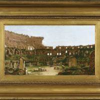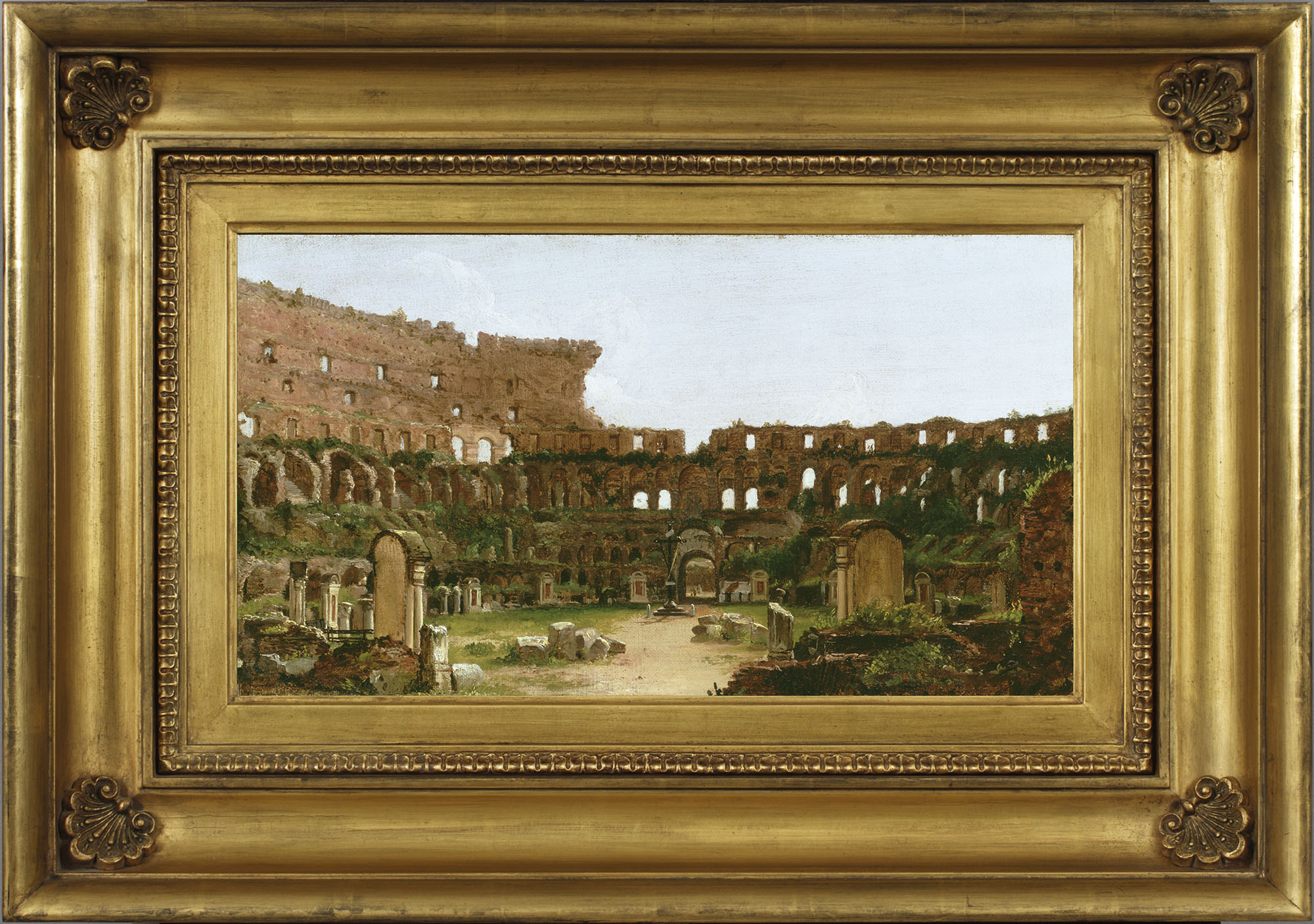 Already well established as a painter of American landscapes, in 1829 Thomas Cole moved to Europe for three years. To succeed as something more than a painter of American scenes, he felt, would require seeing firsthand works by the old masters and famous landscapes of the Old World. He said the subject of this painting, the ancient Colosseum in Rome, was the spot that affected him most deeply among all the remnants of classical civilization he saw. Prominent Christian symbols—such as the large black cross at center—standing in the midst of pagan Rome's most celebrated structure provide an unmistakable affirmation of the triumph of Christianity over the Roman state. Cole's studies abroad transformed him and his art, leading him to pursue in an ambitious series of future paintings, the rise and fall of civilizations, the cycles of time, and the regenerative forces of nature. This work is part of the Albany Institute's premier collection of more than 500 works by Cole, founder of the Hudson River school of painting.