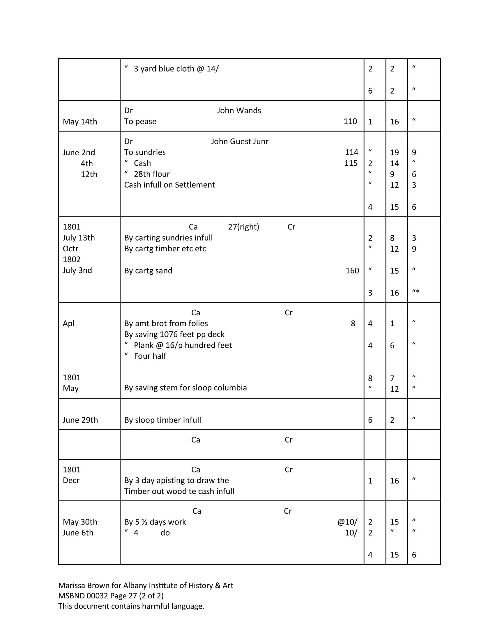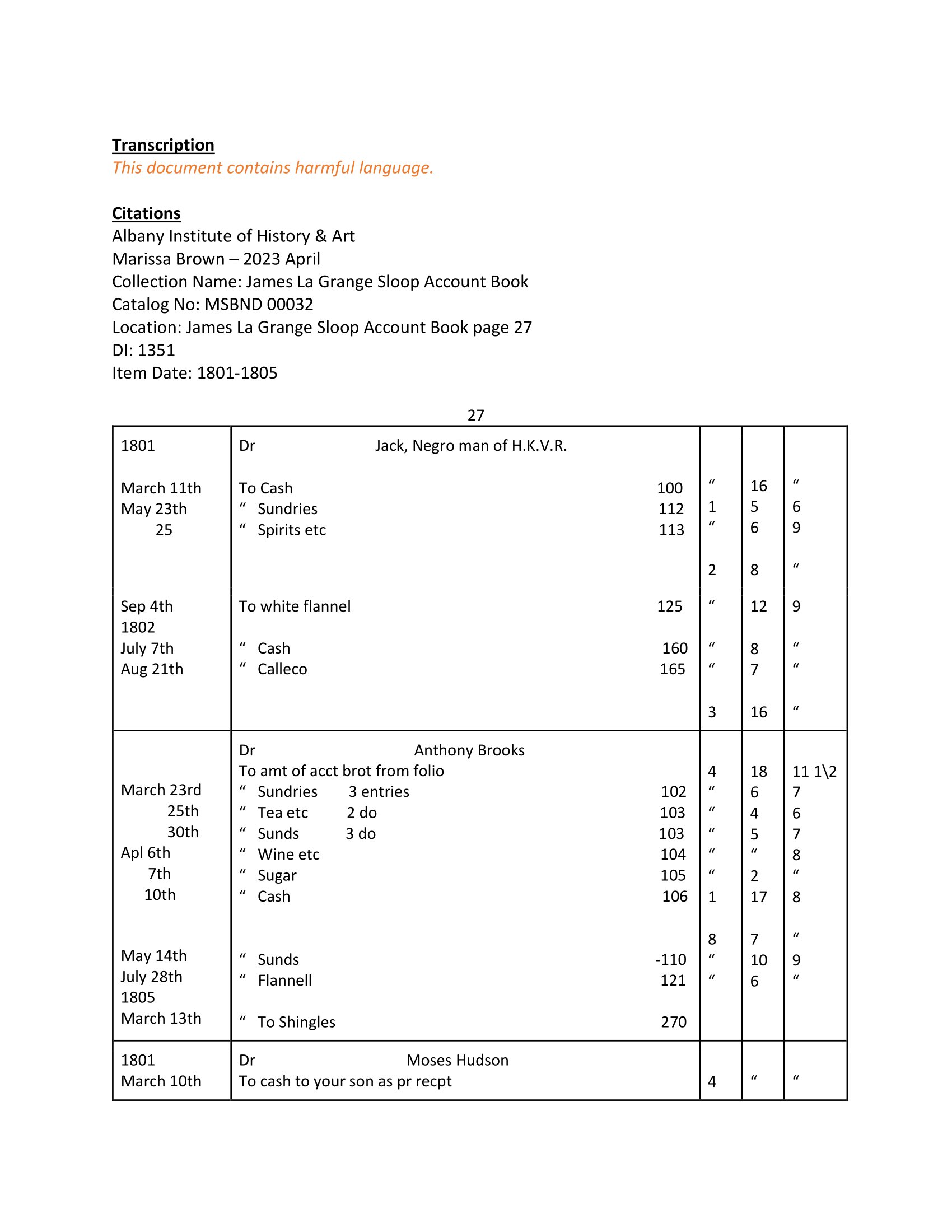 Jack - 1801 cartman, account for cash and goods with James LaGrange
