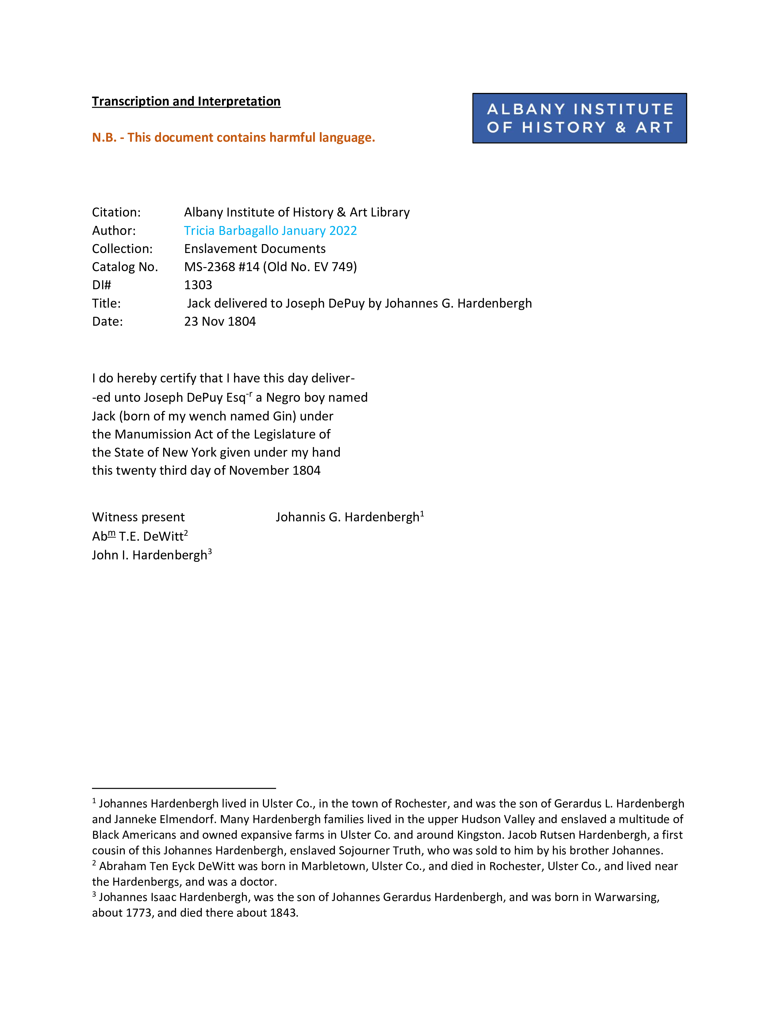 Jack - 1804 manumitted by Johannes G. Hardenbergh