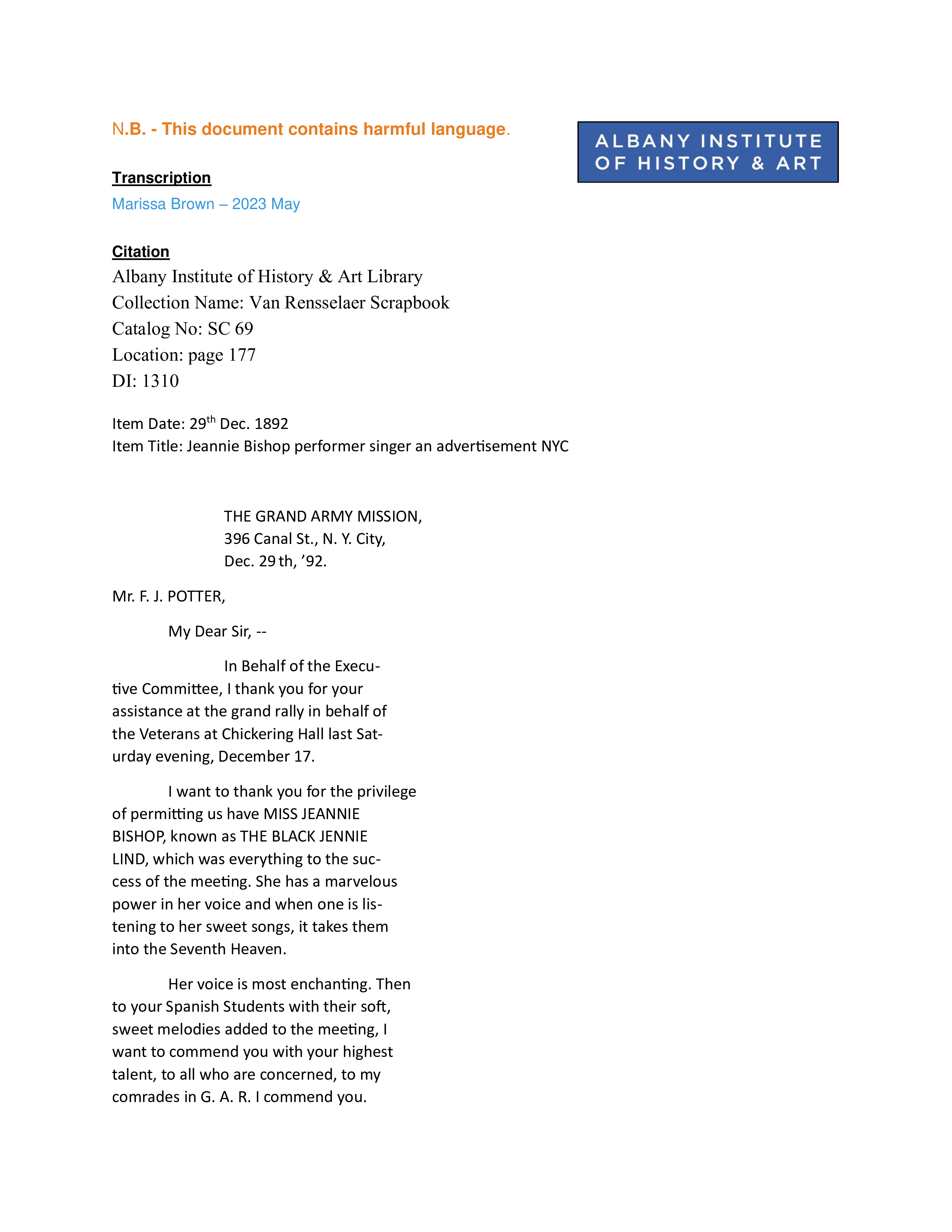 Jeannie Bishop - 1892 review and praise for singing performance in N.Y.C.