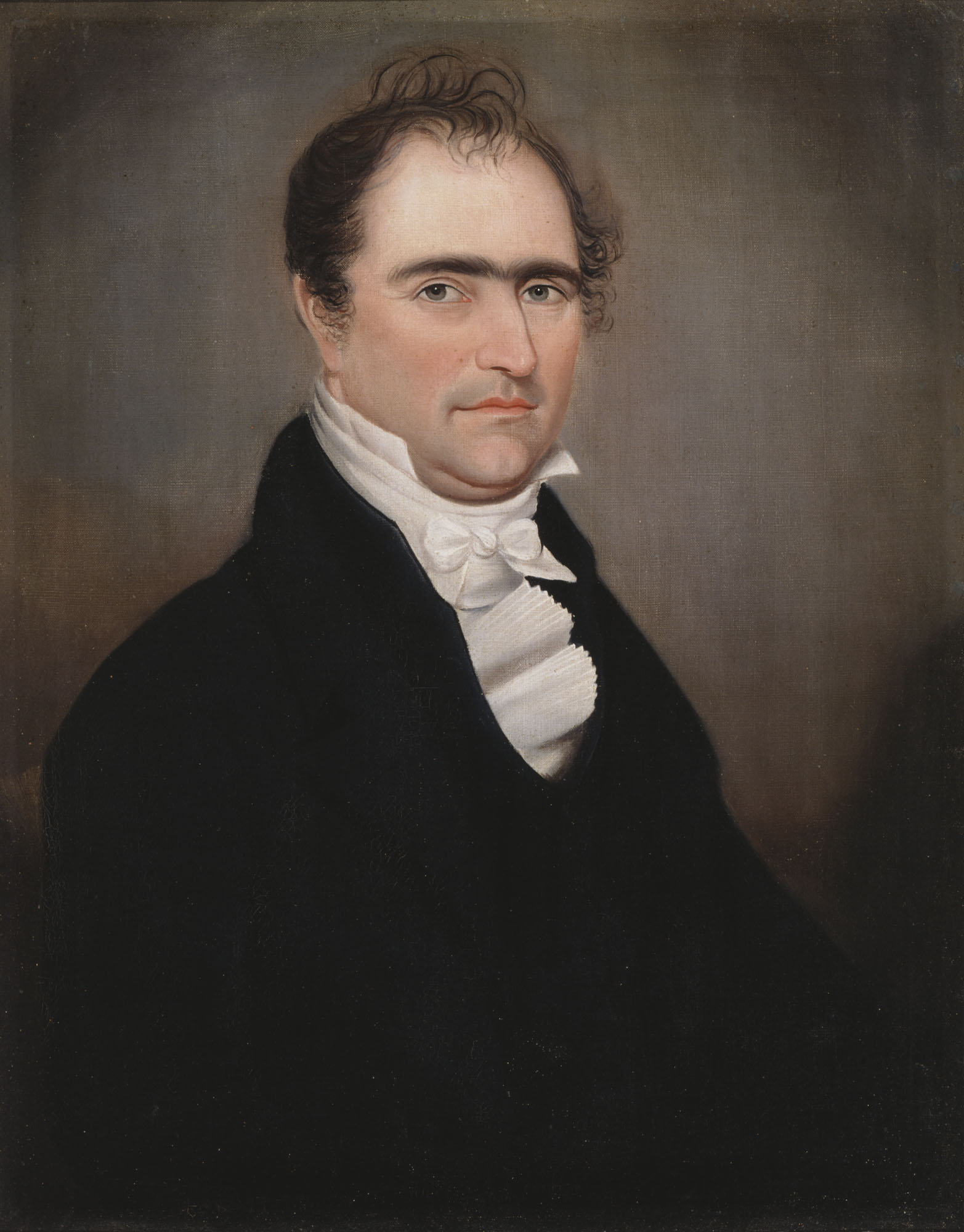 Vanderpoel was a lawyer, and later a judge who lived in Kinderhook, NY, and this portrait—and the companion one of his wife Anna Doll Vanderpoel—undoubtedly hung in their substantial Federal-style home there. The couple later moved to Albany, where James enjoyed a long and successful career as a politician, businessman, and judge. The fifty-year career of portrait painter Ammi Phillips represents one of the most prolific, artistically successful, and perhaps financially stable of any nineteenth-century itinerant American folk artist. The self-taught artist created somewhere between 600 and 2,000 paintings, many of them portraits of middle class people living in rural areas. This painting—considered part of the artist's "realistic period,"—shows a greater degree of sophistication through the use of facial modeling with light and shadow than his earlier works. The stenciled frame is the original one.