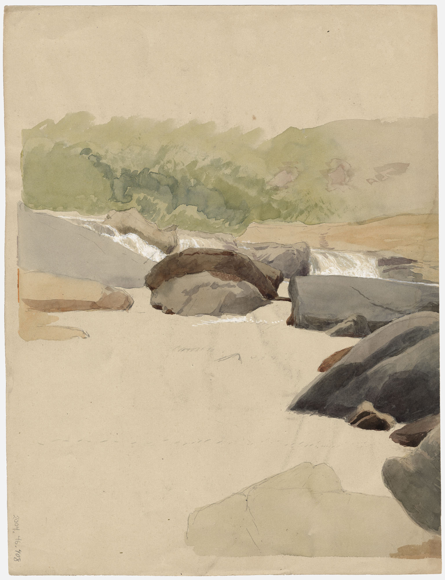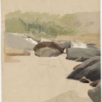 On reverse, an unfinished watercolor sketch of a stream with large boulders.