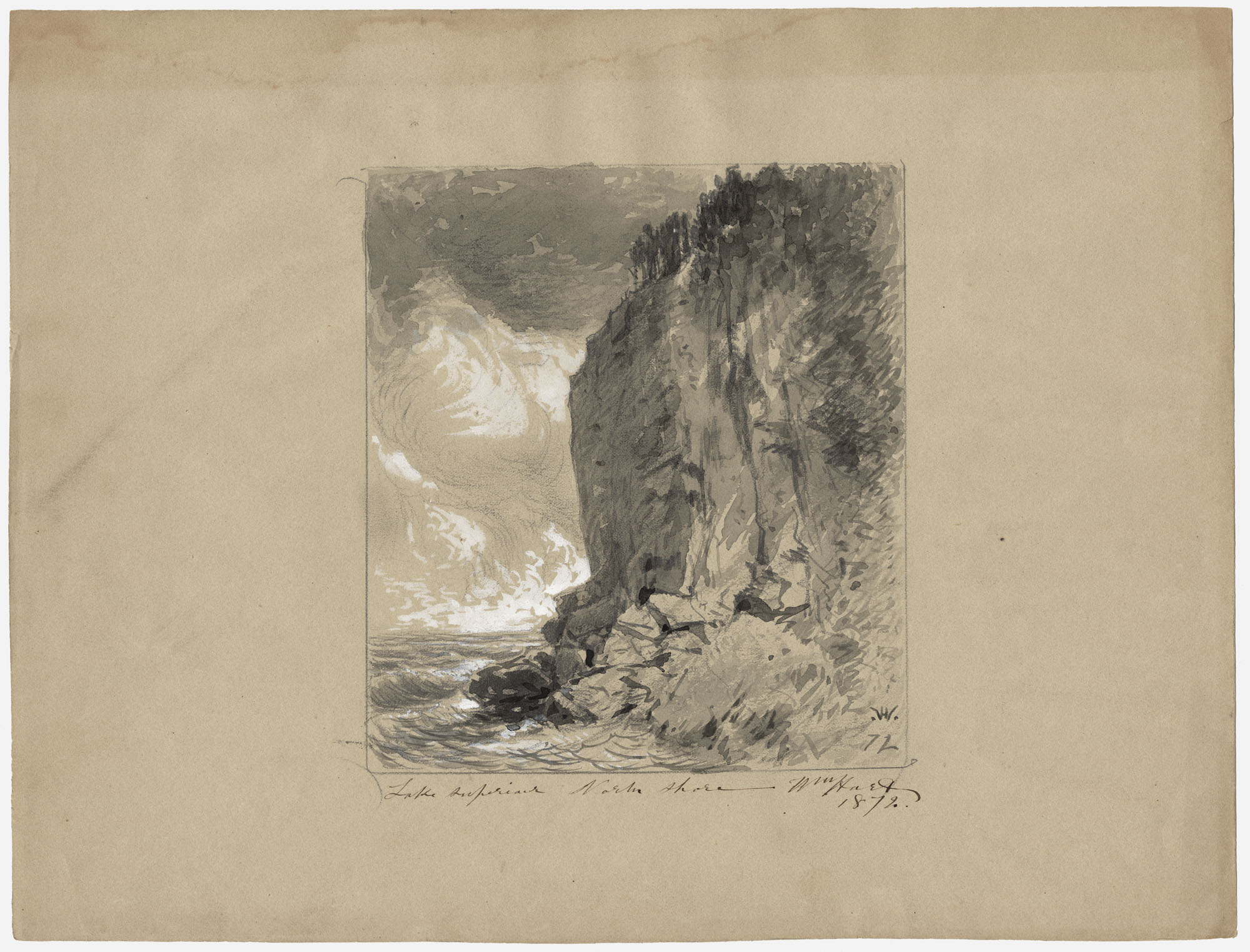 Inscribed in ink wash within image lower right: WH [logo]/72; inscribed in ink underneath image: Lake Superior North Shore Wm Hart / 1872