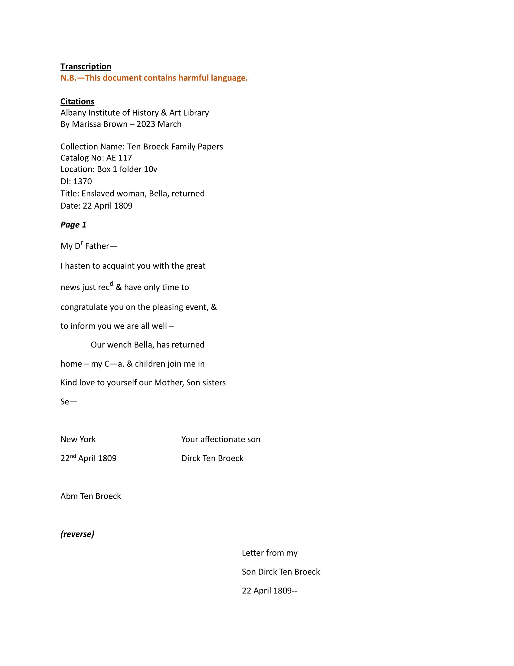 Letter - Apr. 22, 1809 Dirck Ten Broeck to his father Abraham Ten Broeck