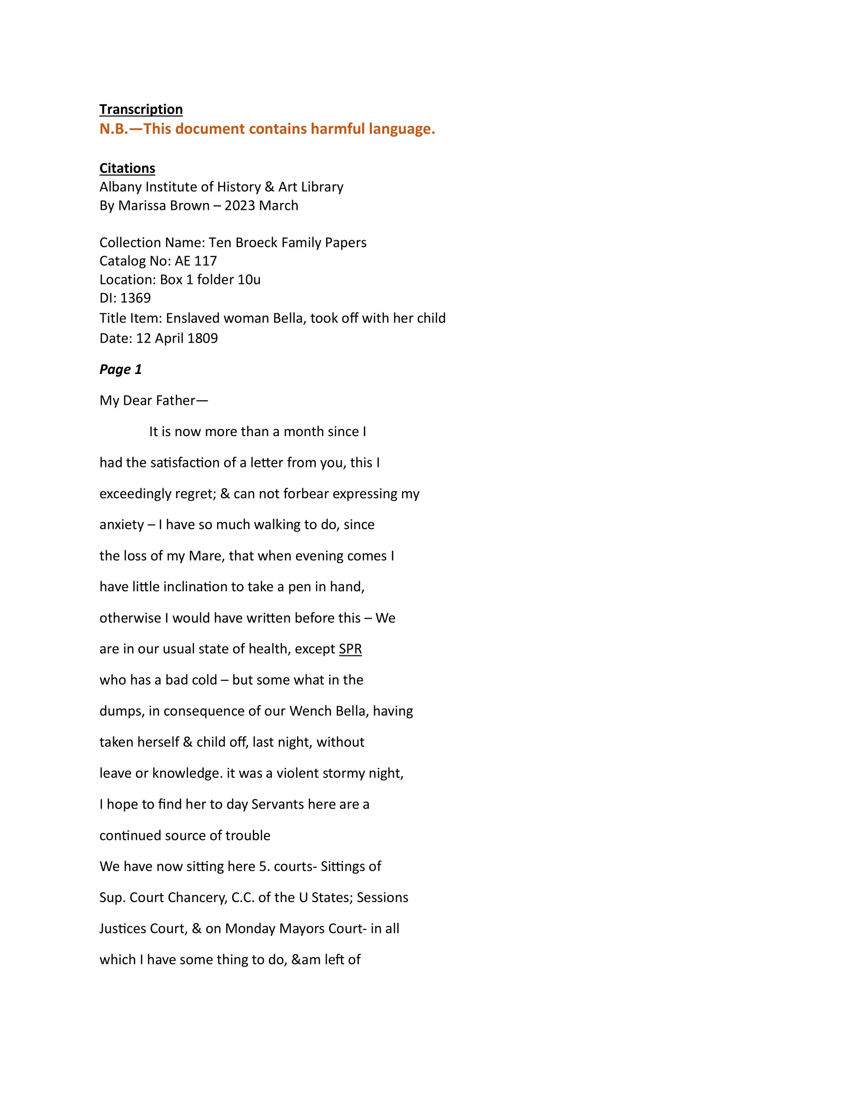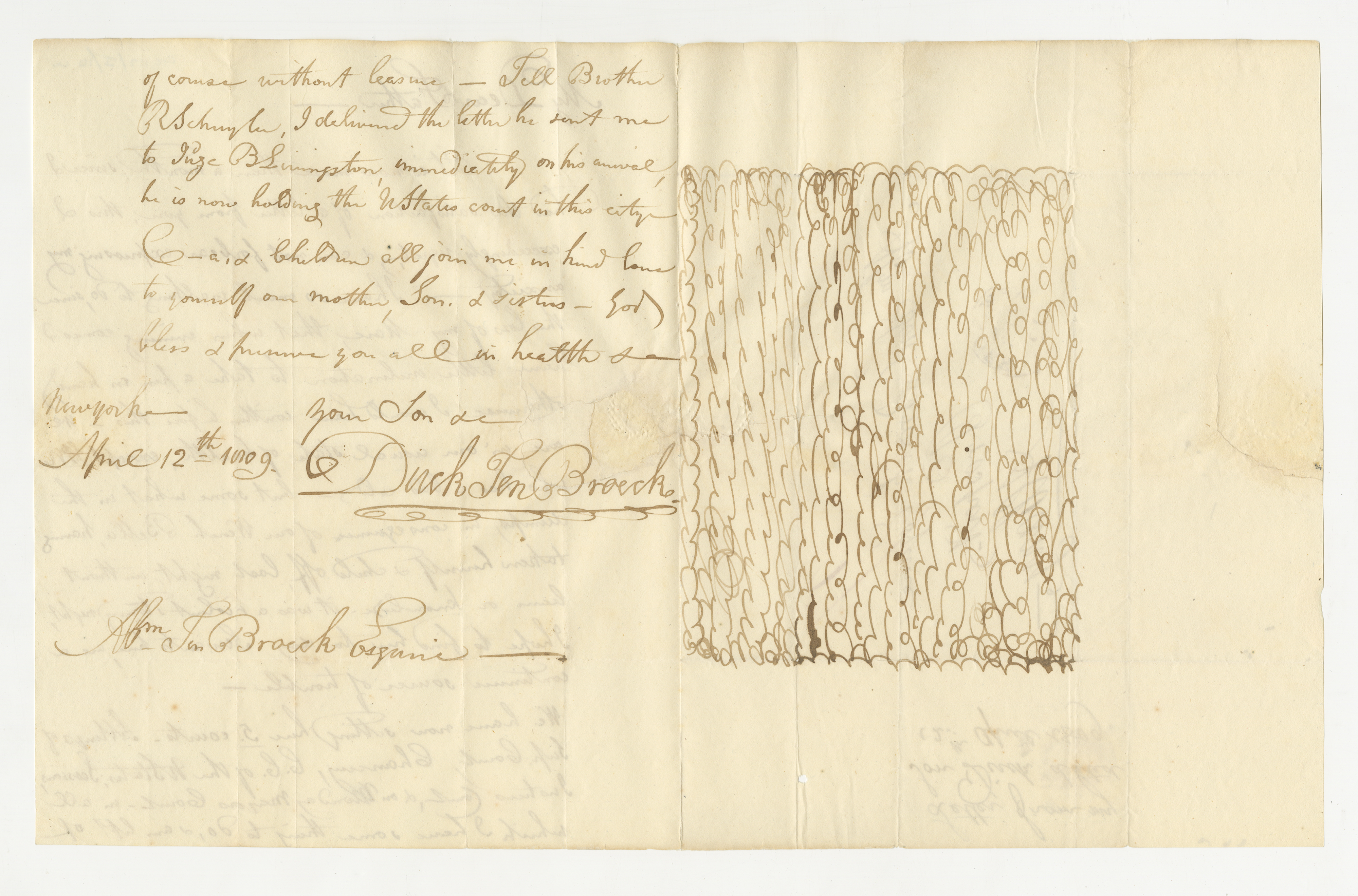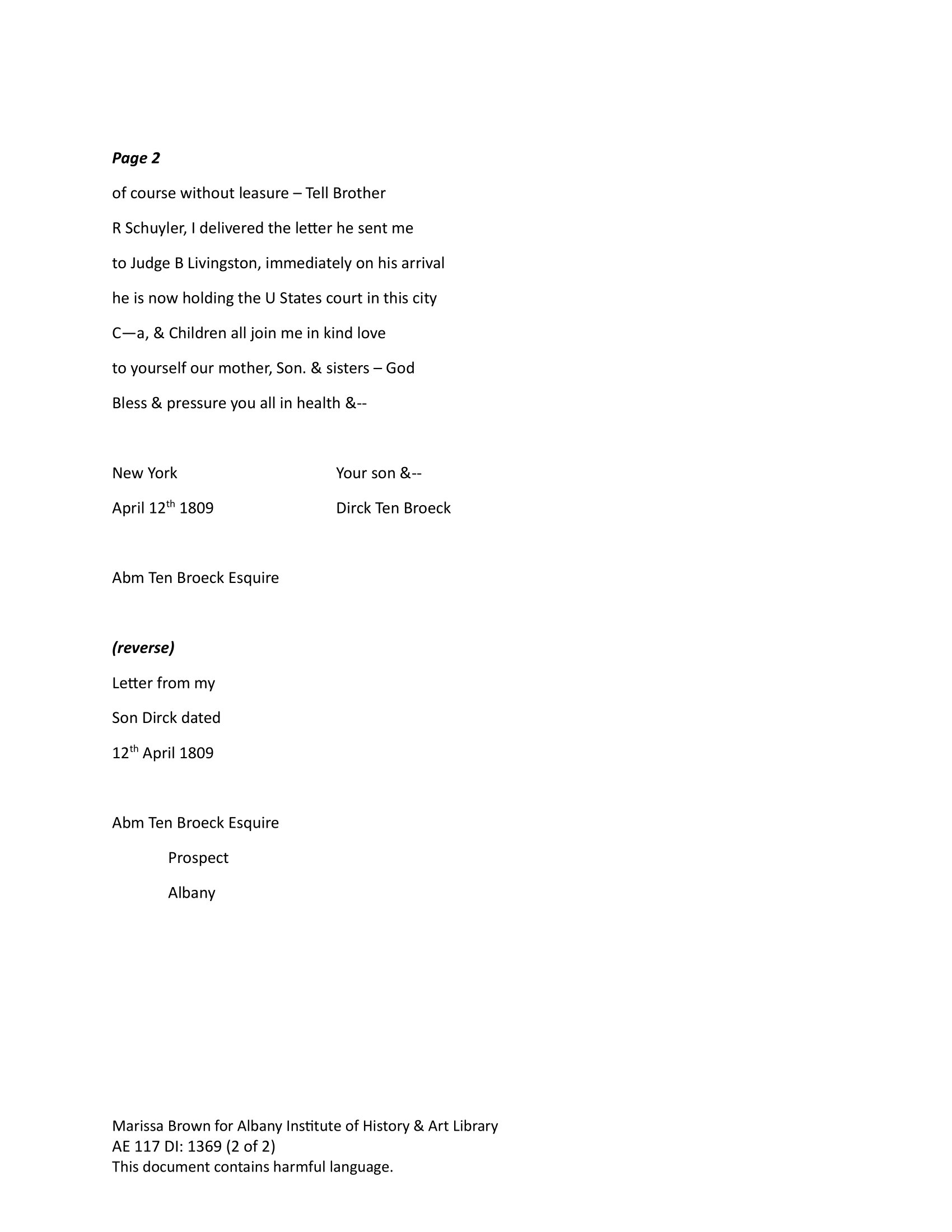 Letter - Apr. 12, 1809 Dirck Ten Broeck to his father, Abraham Ten Broeck
