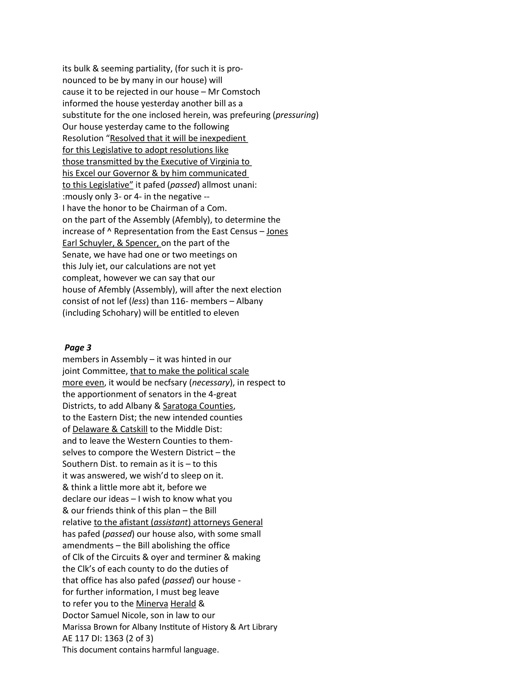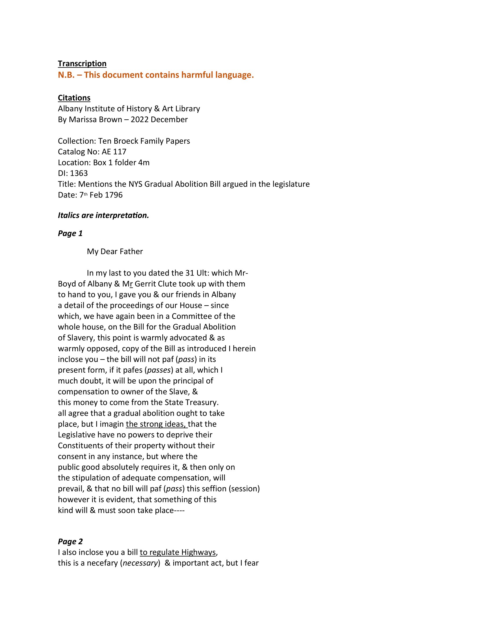 This letter mentions the NYS Gradual Manumission Bill being argued in the state legislature.