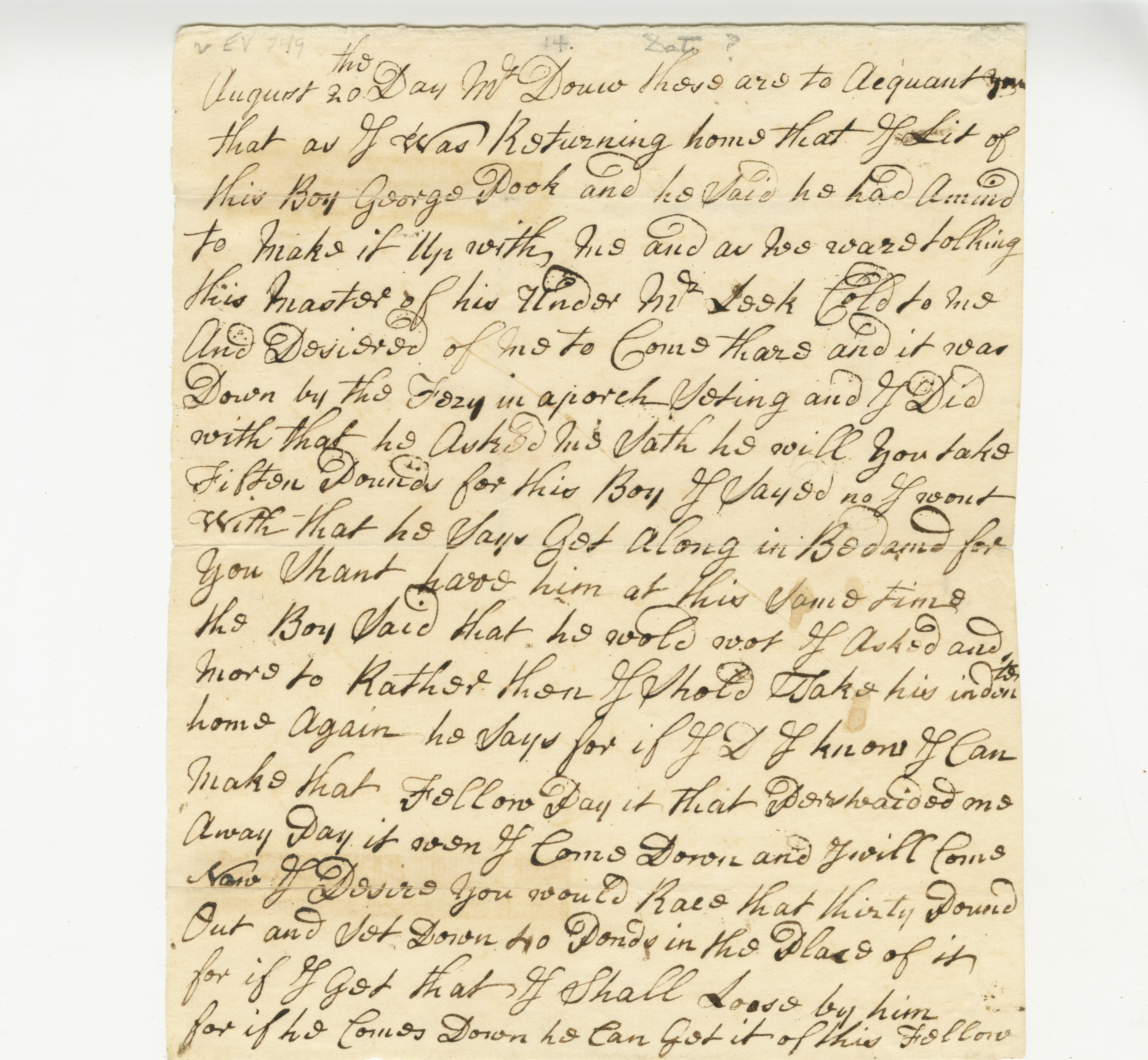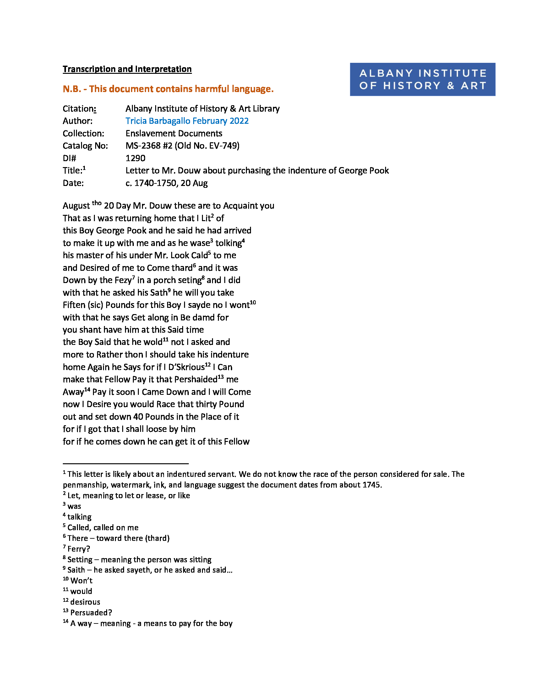 This letter is not likely about an enslaved person. It is most likely a letter about an indentured servant, but we do not know the identity of the person considered for sale.
