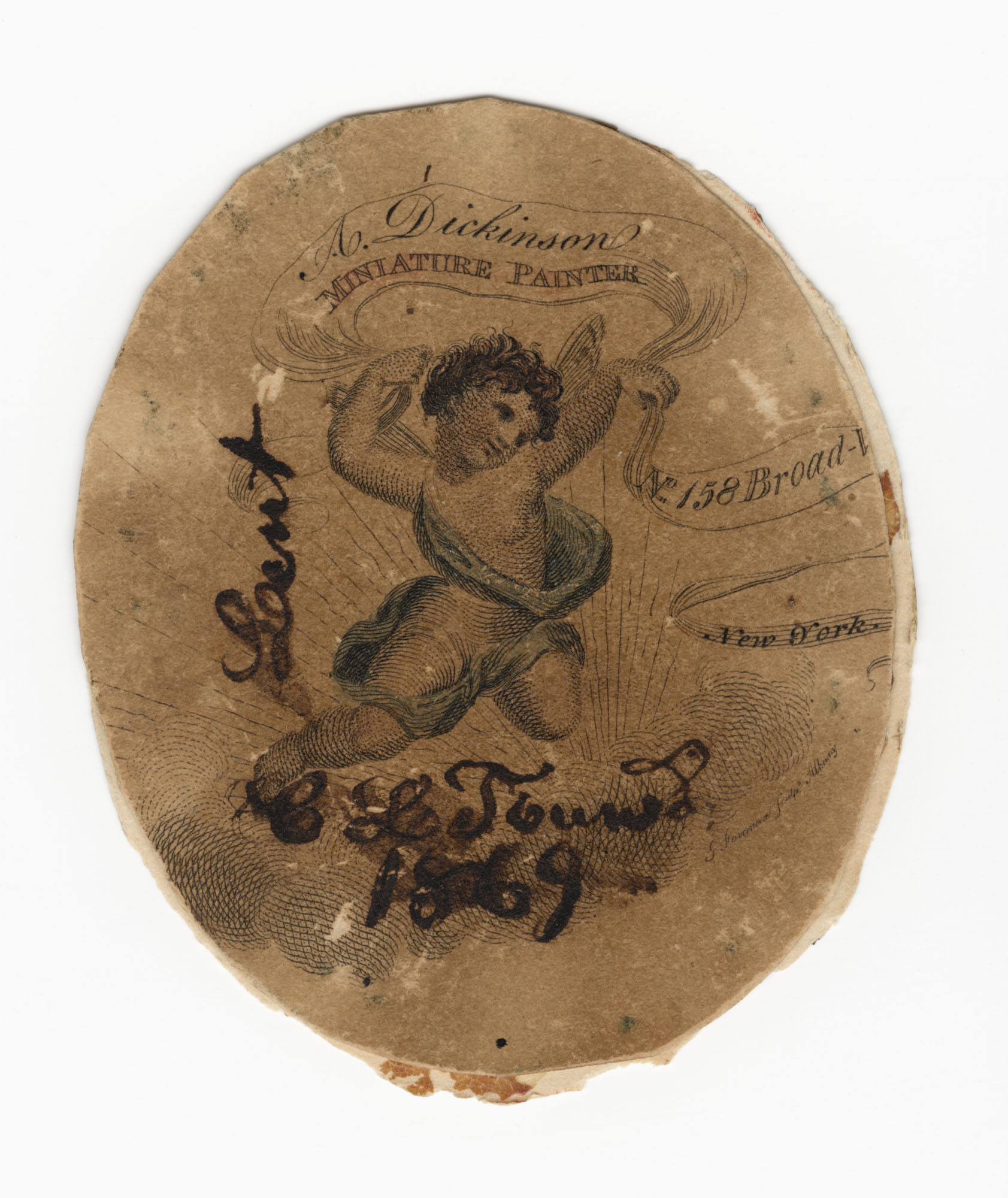 Paper label attached to reverse, engraved: A. Dickinson / MINIATURE PAINTER / No. 158 Broad[?] / New York. and G. Fairman Sculp. Albany; inscribed in ink: Lent / C [?] Townd / 1869