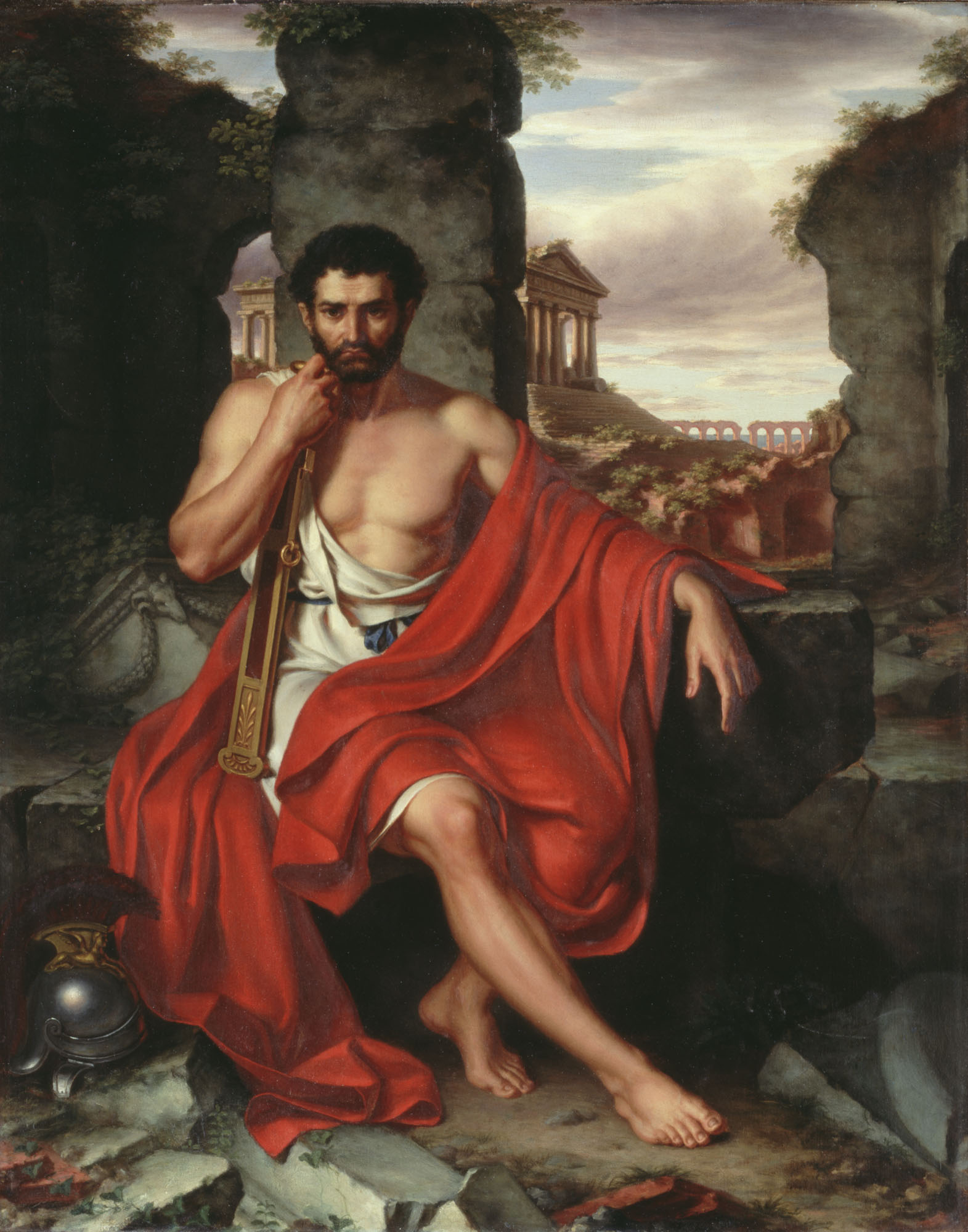 John Vanderlyn was one of the leading American historical painters of the early nineteenth century, and with this work, becomes the most dedicated proponent of the neoclassical aesthetic in America. The subject is taken from a story in Plutarch's Lives of the ancient Roman general and consul Caius Marius, who was banished from Rome because of his unbridled passions and ambitions. Marius is seen sitting in exile amid the ruins of Carthage in North Africa, which had been destroyed by Romans. The artist aimed to "reveal in two great instances the instability of human grandeur—a city in ruins and a fallen general." The fate of Marius has been compared with that of the painter's patron, Aaron Burr, whose fortunes changed dramatically after he killed Alexander Hamilton in a duel and was tried for treason. The Albany Institute's Marius is a small version of a painting of the same subject that won Vanderlyn a gold medal at the prestigious Paris Salon of 1808 and is now in the Fine Arts Museums of San Francisco.