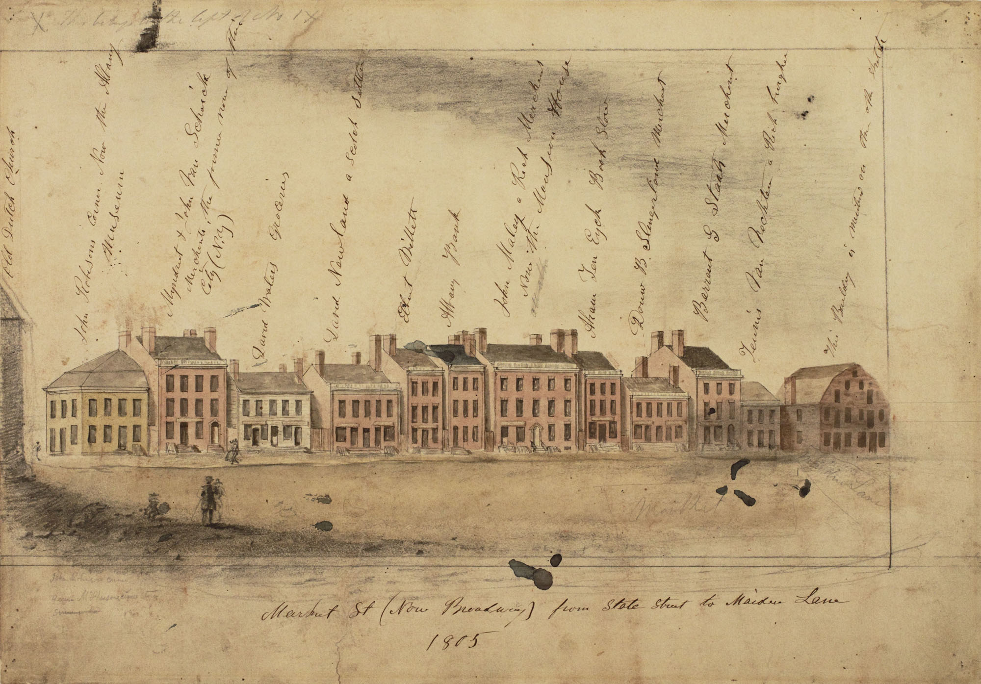 Inscribed bottom center: Market St (now Broadway) from State Street to Maiden Lane / 1805. Legend inscribed above the images.