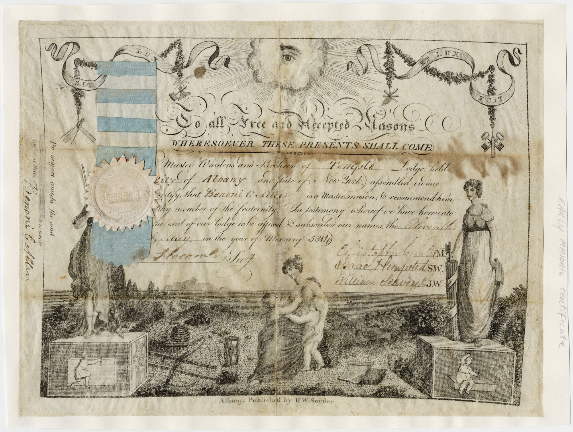 Benoni C. Allen served as coroner for Albany and Albany County during the early decades of the nineteenth century. The certificate indicates that he was admitted as a Master Mason in Temple Lodge, Albany, New York, in the year of Masonry 5814 (1814).