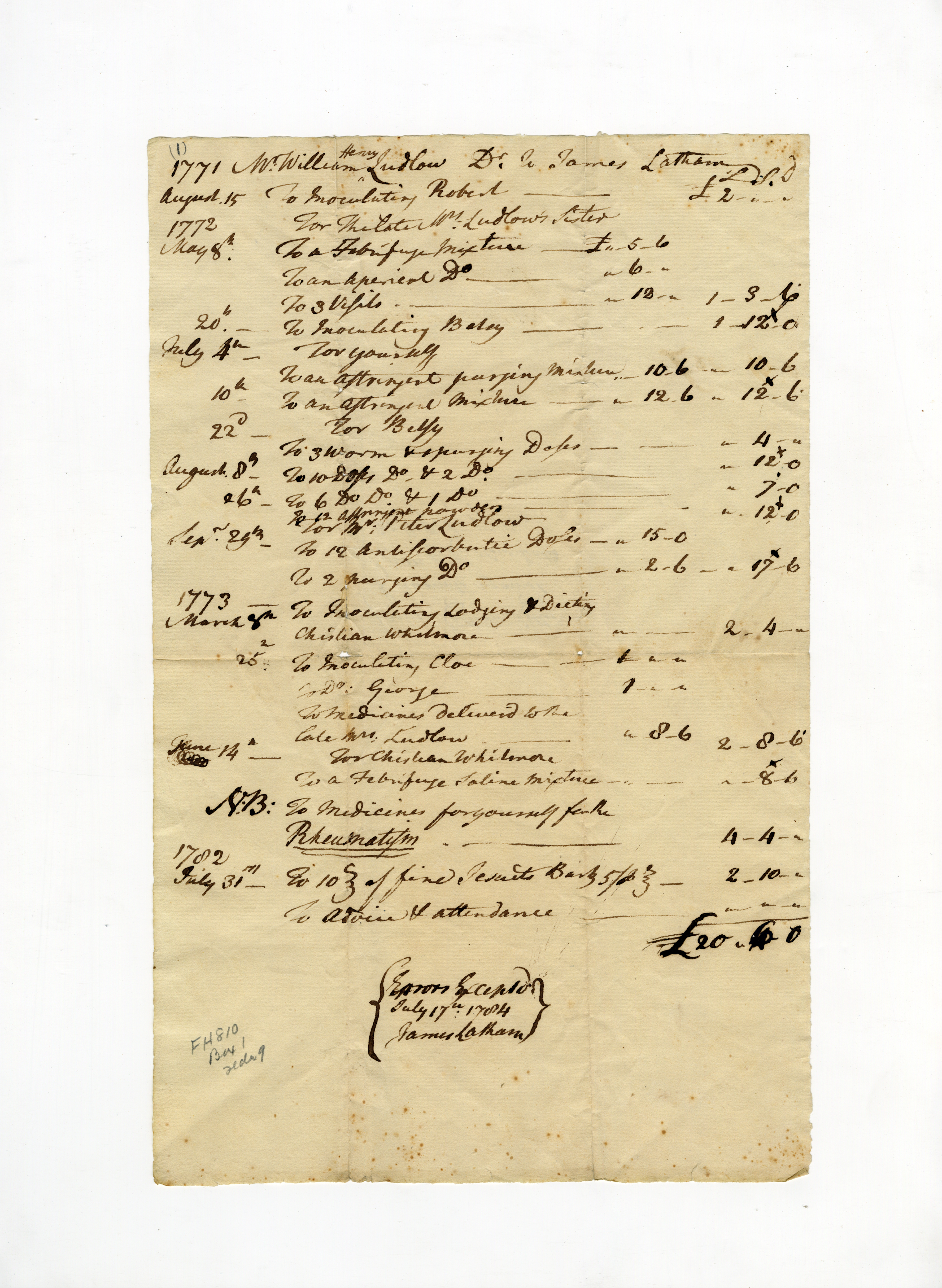 Medical invoice - 1771 Ludlow family of Claverack