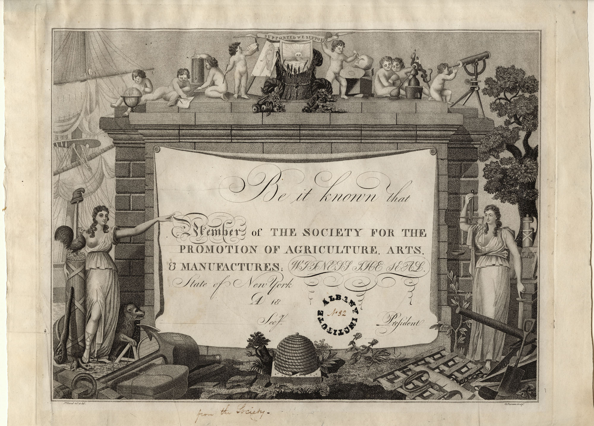 In 1791 the Society for the Promotion of Agriculture, Arts, and Manufactures (SPAAM), the progenitor of the present Albany Institute of History & Art, was founded in New York City, then the capital of New York State. Members received an elegantly engraved certificate graced with allegorical figures of Liberty and Justice. A playful group of putti engage in artistic and scientific activities at the top.