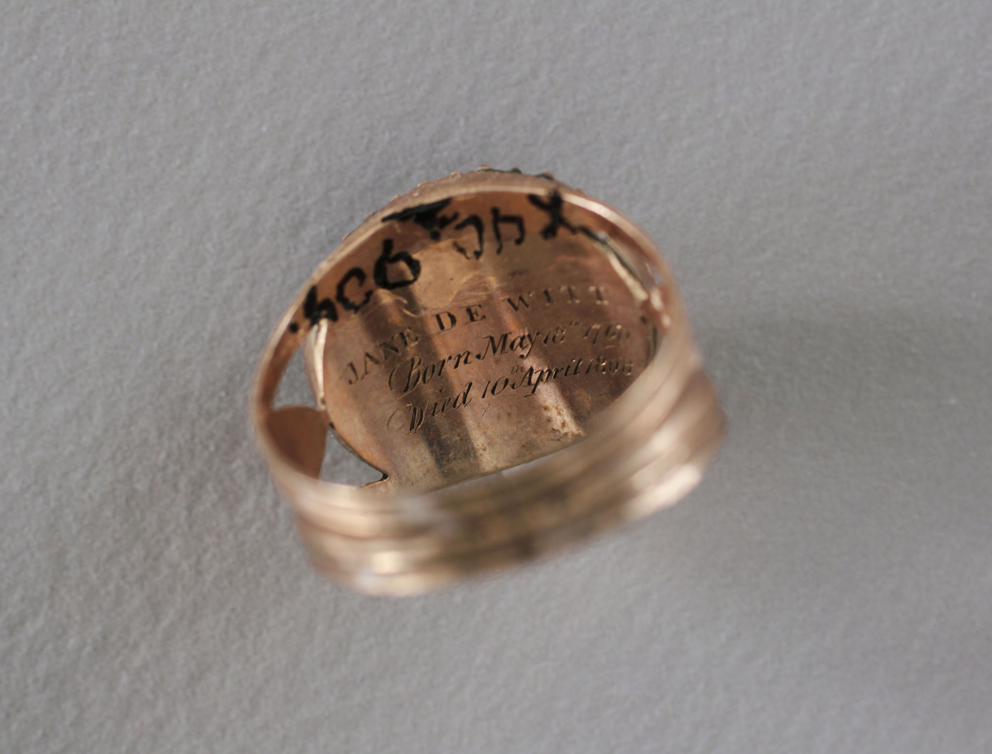 This mourning ring commemorates Jane DeWitt (1760–1808), daughter of John and Jane Varick, and the second wife of New York State Surveyor General Simeon DeWitt. Their son, Richard Varick DeWitt, became a civil engineer and an accomplished artist. (The Albany Institute has several of Richard DeWitt's watercolor sketches of steamboats and steam engines.)