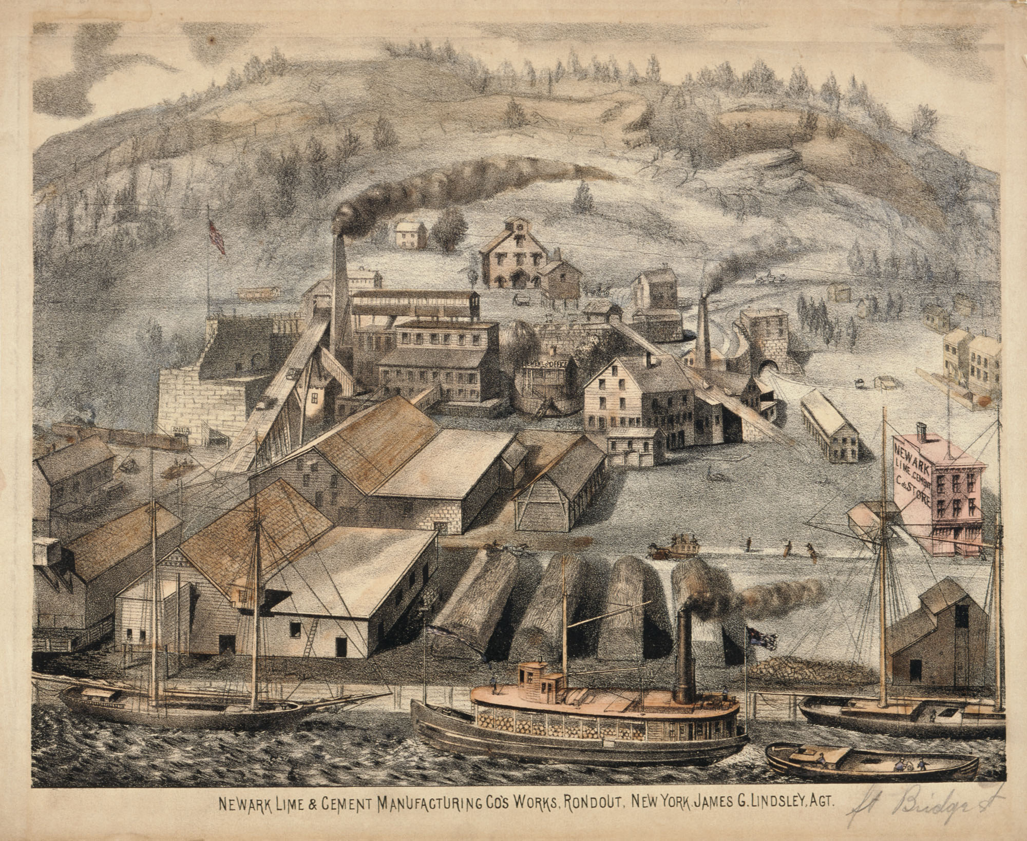 Printed in margin beneath image: NEWARK LIME & CEMENT MANUFACTURING CO'S WORKS, RONDOUT, NEW YORK. JAMES G. LINDSLEY, AGT.; inscribed in pencil lower right: ft Bridge St