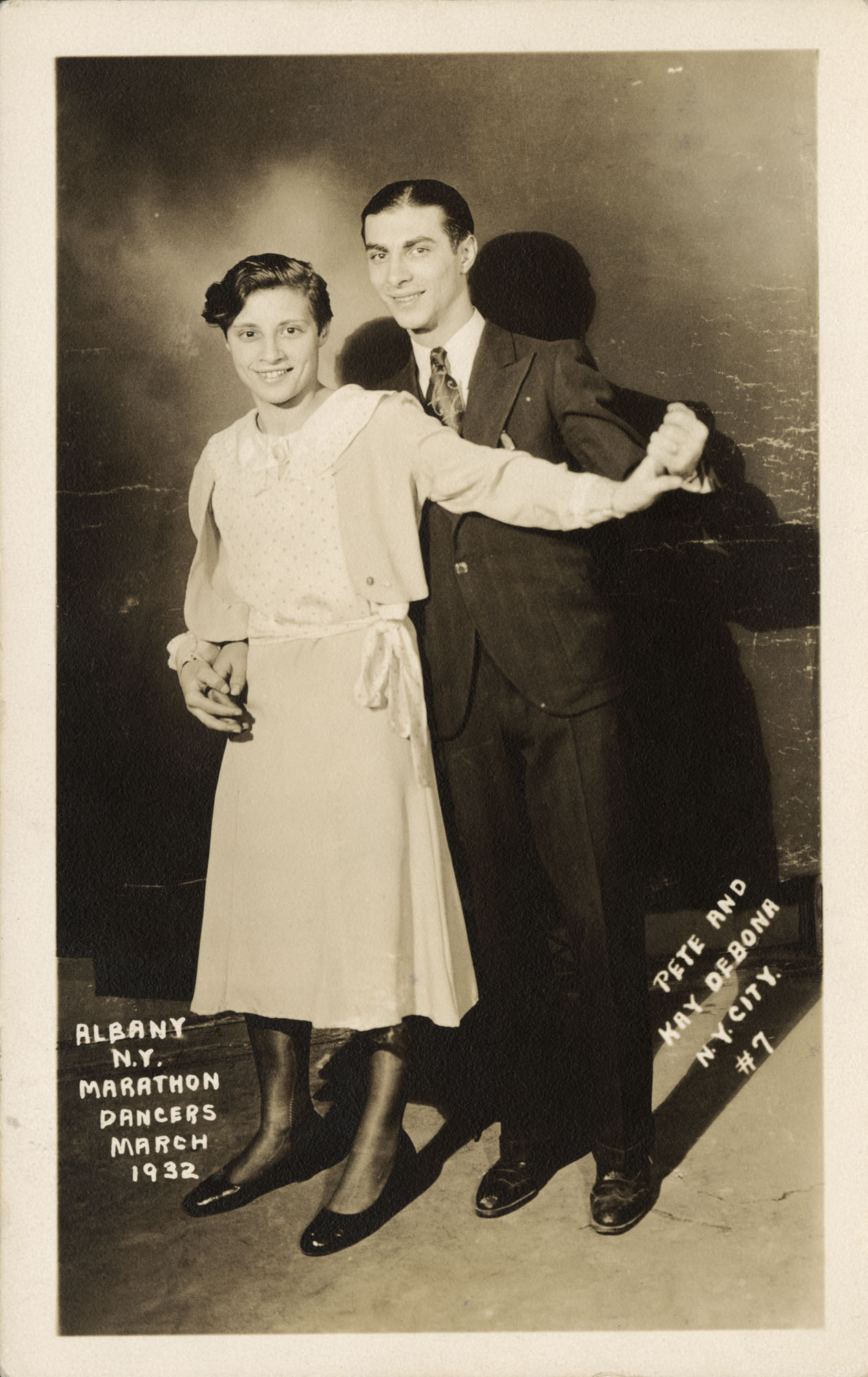 Inscribed on front, bottom left: Albany N.Y. Marathon Dancers March 1932. Inscribed on front, bottom right: Pete and Kay Debona, N.Y. City # 7. Inscribed in pencil on reverse: PKG XVII # 79f, Dancingly Yours, Pete and Kay De Bona. Brother and Sister Team # 7, April 1932. Rubber stamped on reverse: Post Card - Correspondence