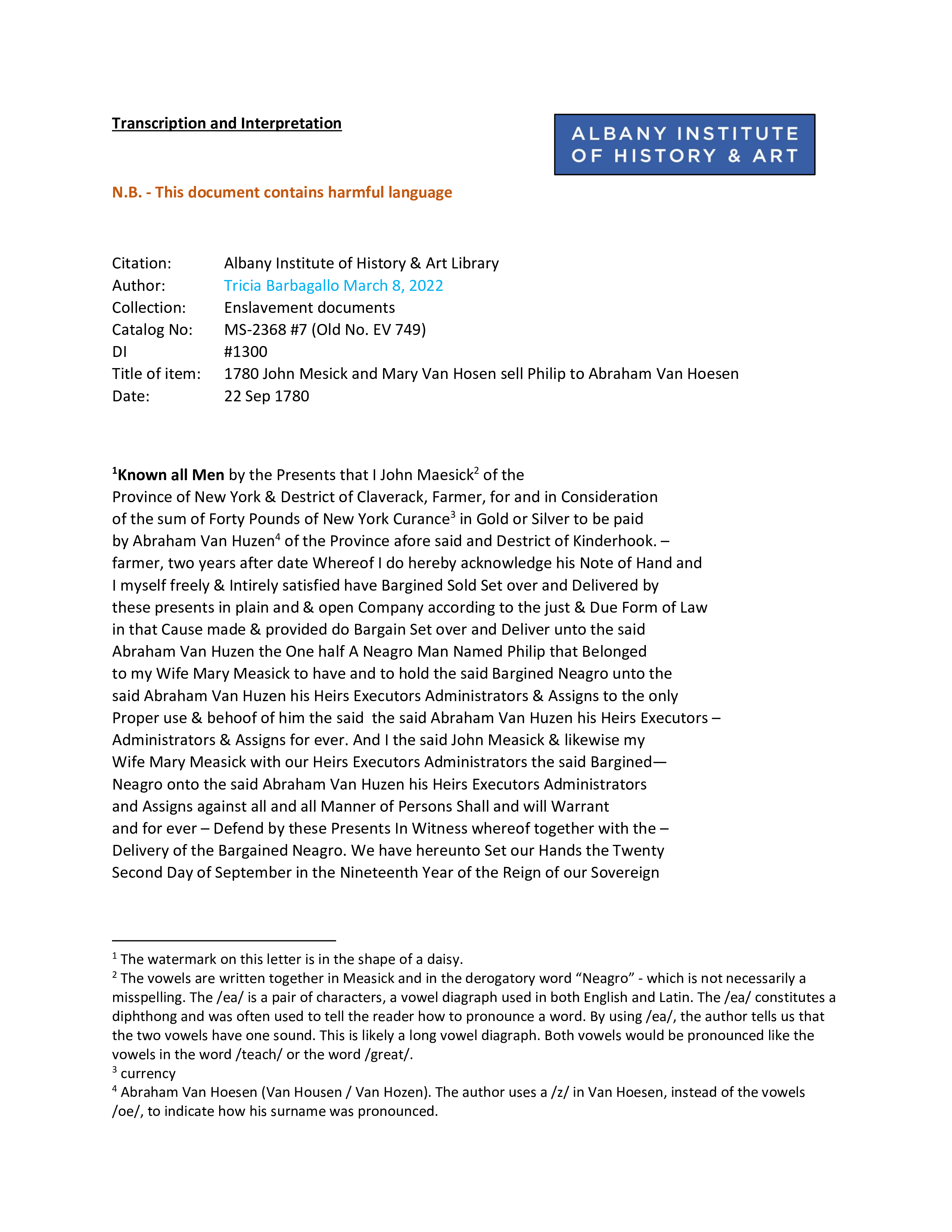 Bill of sale, transferring Philip from John and Mary Mesick to Abraham VanHoesen