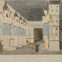 This volume of forty-four plates accompanies Giovanni Belzoni's, Narrative of the Operations and Recent Discoveries within the Pyramids, Temples, Tombs, and Excavations, in Egypt and Nubia; and of a Journey to the Coast of the Red Sea, in Search of the Ancient Berenice; and another to the Oasis of Jupiter Ammon (London: John Murray, 1821). Plates consist of hand-colored lithographs, printed by C. Hullmandel's Lithography, and hand-colored and uncolored etchings depicting wall paintings, temples, the Pyramids, topographical views, natural history studies, etc.