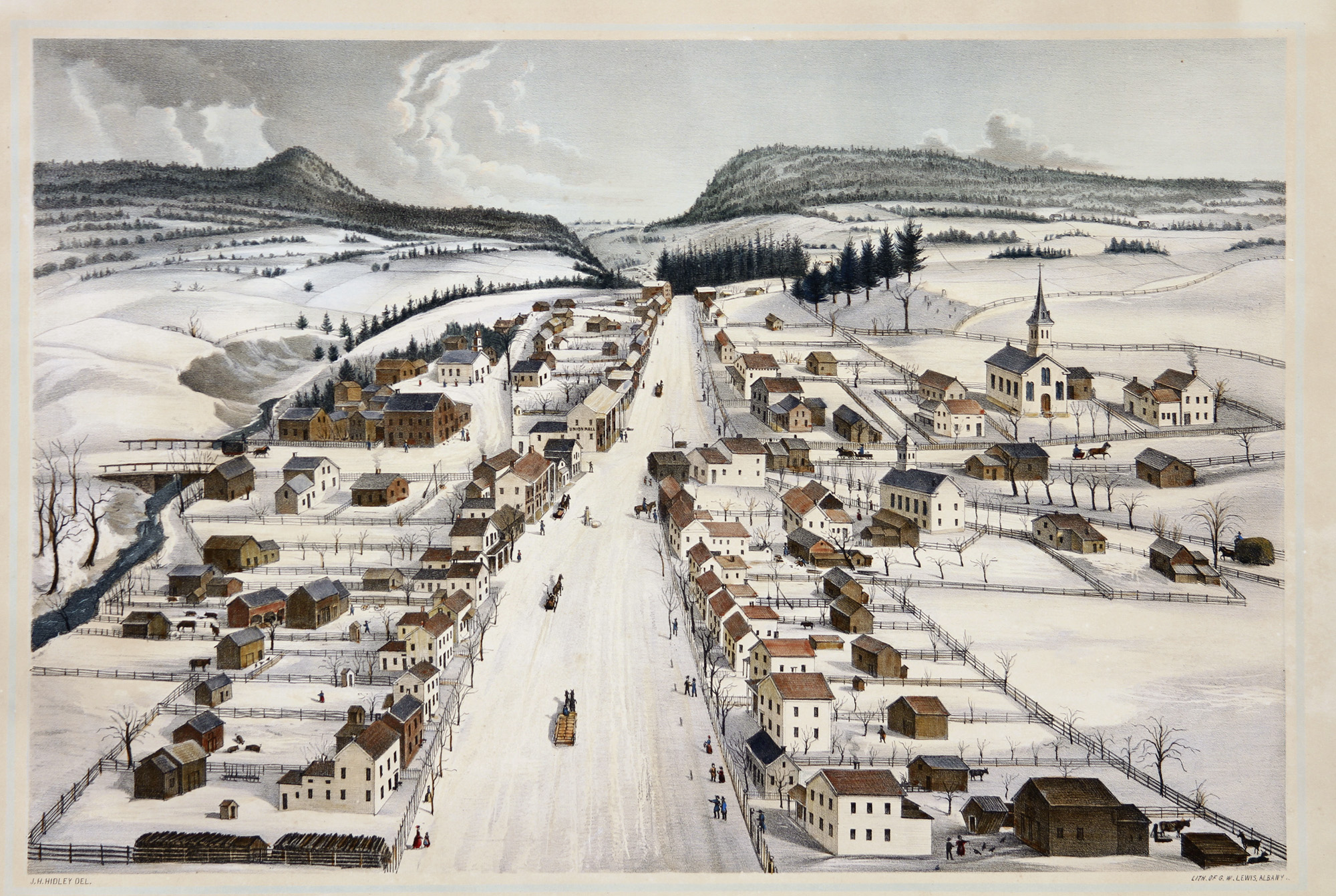 The circumstances that led to the printing of one of Joseph Hidley’s Poestenkill townscapes are not known. Did Hidley solicit the Albany lithographer G. W. Lewis to make a print of his painting, or did Lewis see the painting elsewhere and spot a commercial opportunity? There are no surviving records to indicate whether or not Hidley received any profit from the prints but certainly they disseminated the artist’s name to a greater audience than his paintings alone could have accomplished.