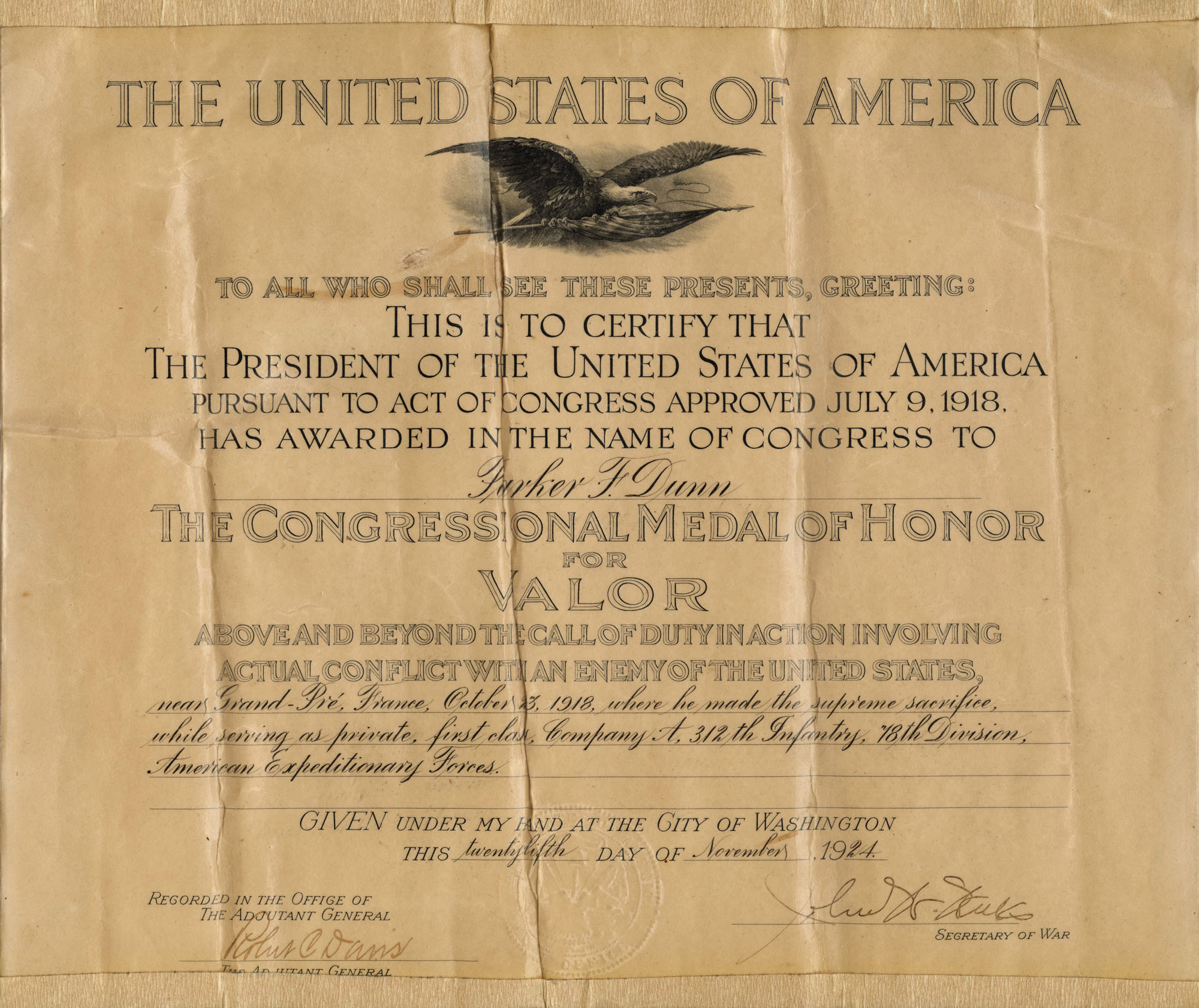 Proclamation Awarding the Medal of Honor to Parker F. Dunn by President Calvin Coolidge