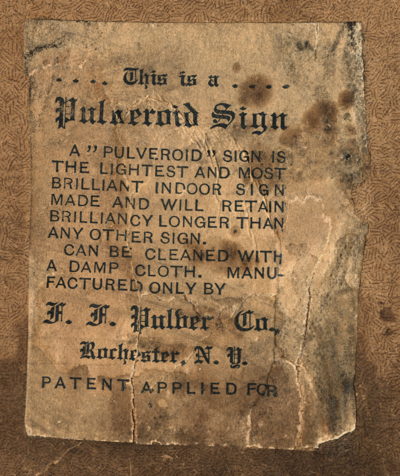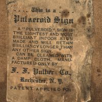 Printed bottom right front: F. F. Pulver Co., Rochester, N.Y.; printed paper label adhered to reverse: This is a/Pulvuroid Sign/A "Pulveroid" sign is/the lightest and most/brilliant indoor sign/made and will retain/brilliancy longer than/any other sign./Can be cleaned with/a damp cloth. Manu-/factured only by/F. F. Pulver Co.,/Rochester, N. Y./Patent applied for