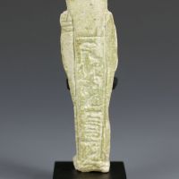 This small shabti and another in the collection (2013.1.15) are inscribed on the back "Psamtik, son of "Psamtik." Small shabtis do not have the full shabti spell inscribed on them, only the title, the "Osiris," and sometimes the owner's profession (in this case, a priest). Psamtik I founded the 26th Dynasty, and his name became popular afterwards.