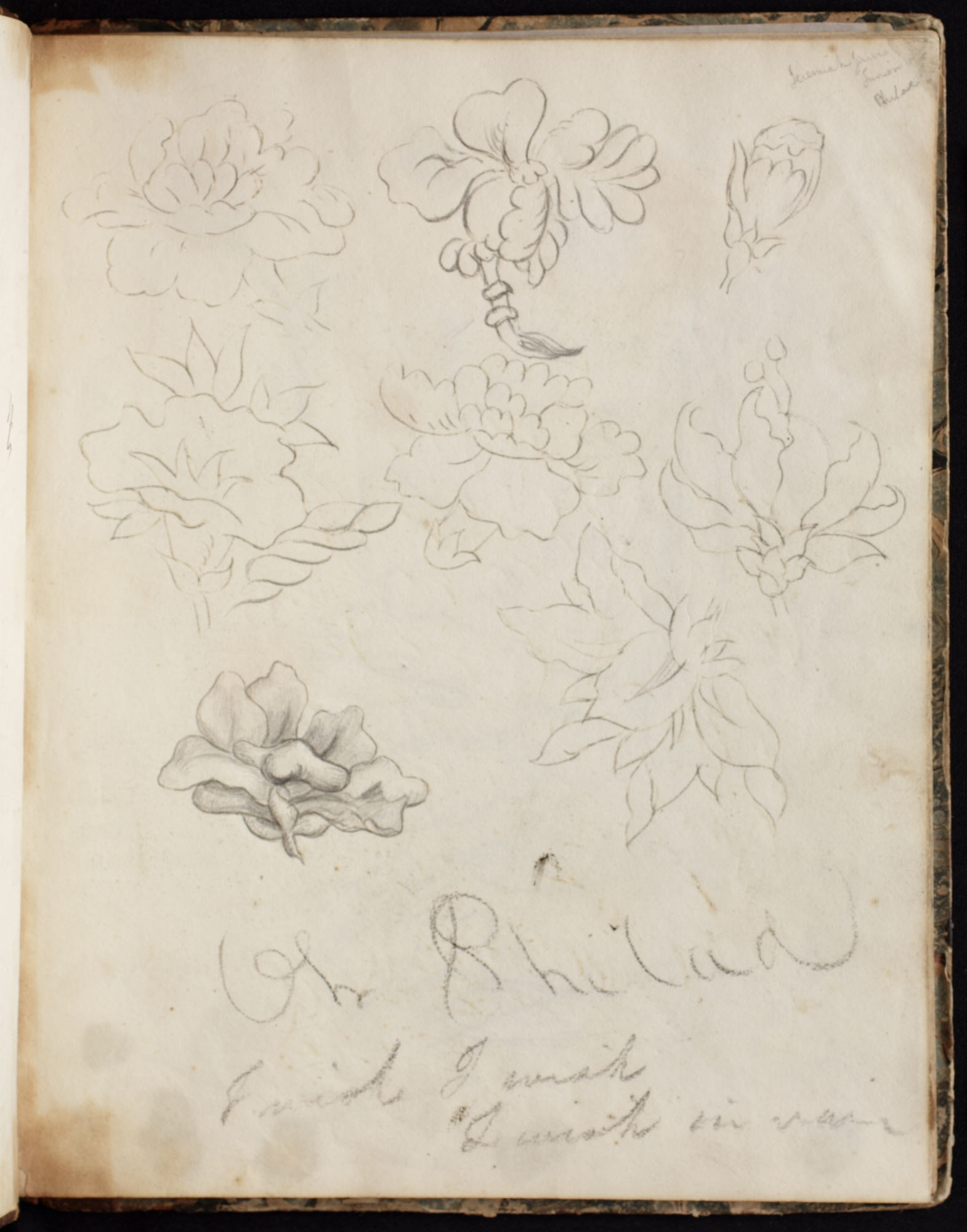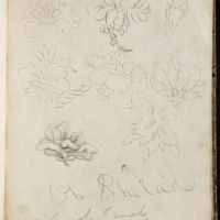 Thomas Cole's early Pittsburgh sketchbook, dated 1823, reveals the artist's fascination with nature, especially individual plants and trees. His close observation of nature is revealed in the color notes he made for the bark of different trees he observed along the Monongahela River and other locations in western Pennsylvania. One page of flower sketches, however, stands out in contrast to the more detailed and naturalistic drawings that Cole was making in 1823. The flowers are distinctively stylized and closely resemble the formulaic flowers and leaves presented in drawing instruction books of the eighteenth and early nineteenth centuries.
