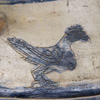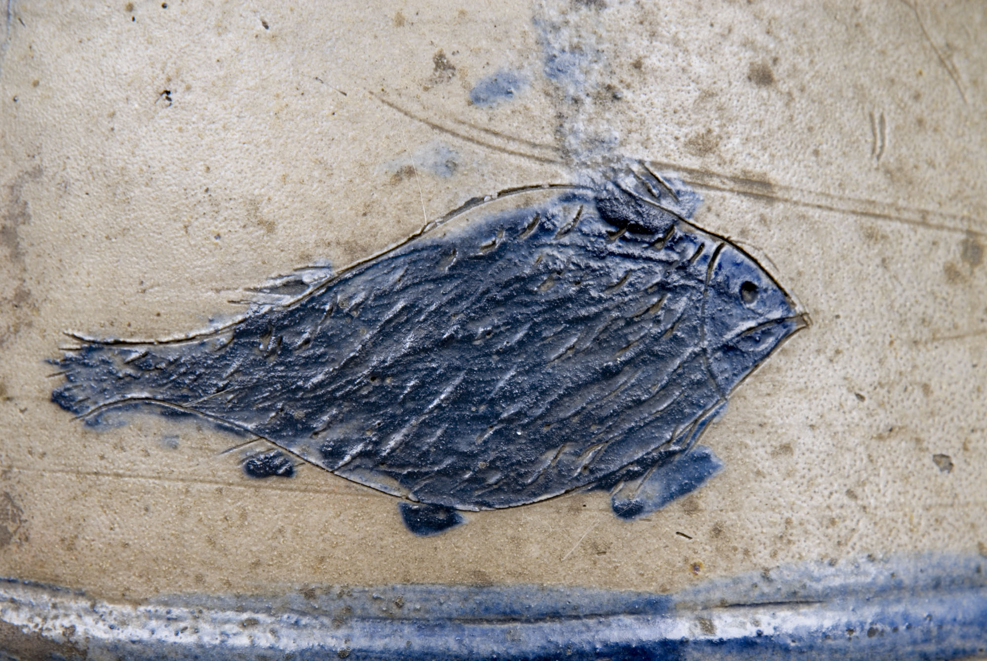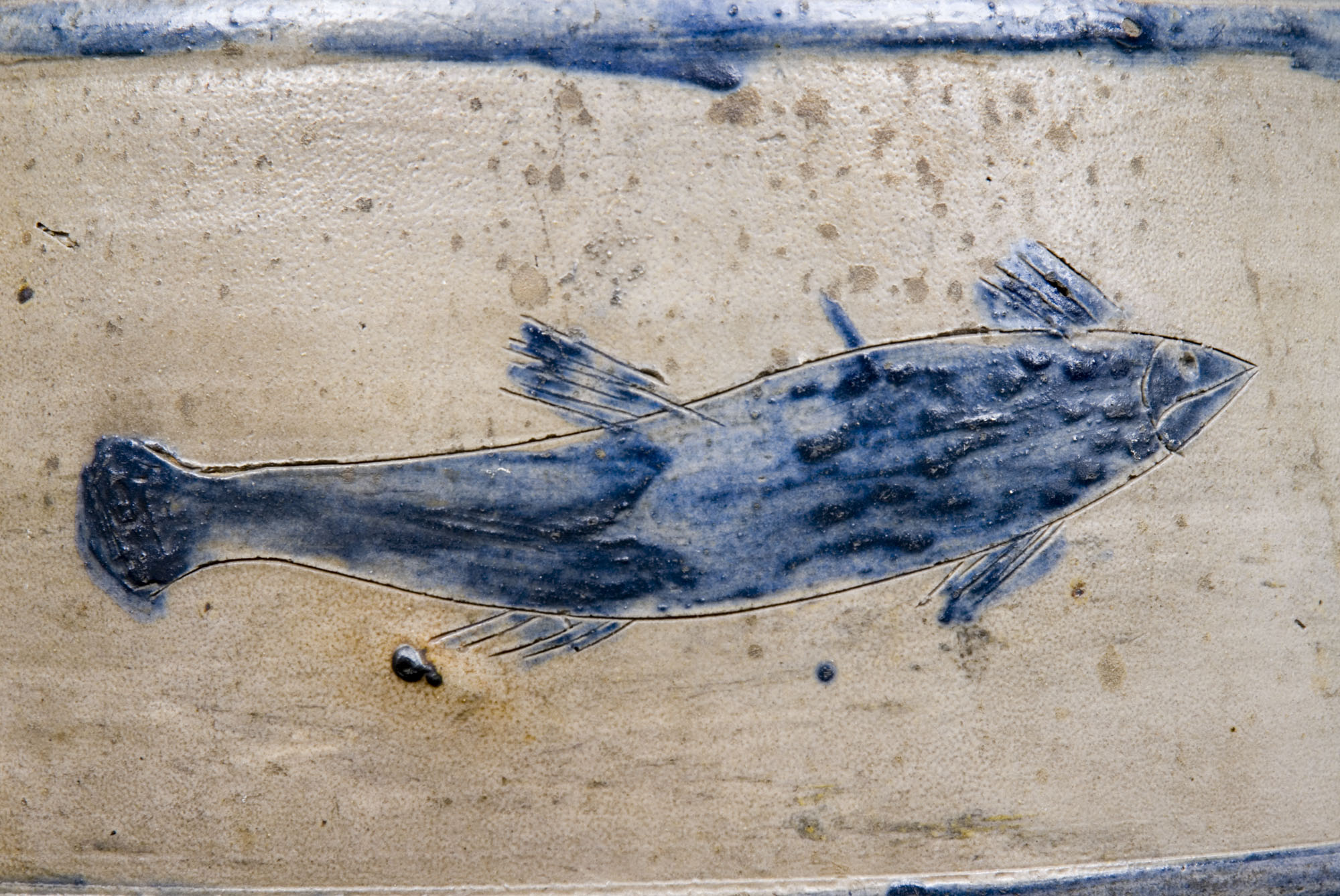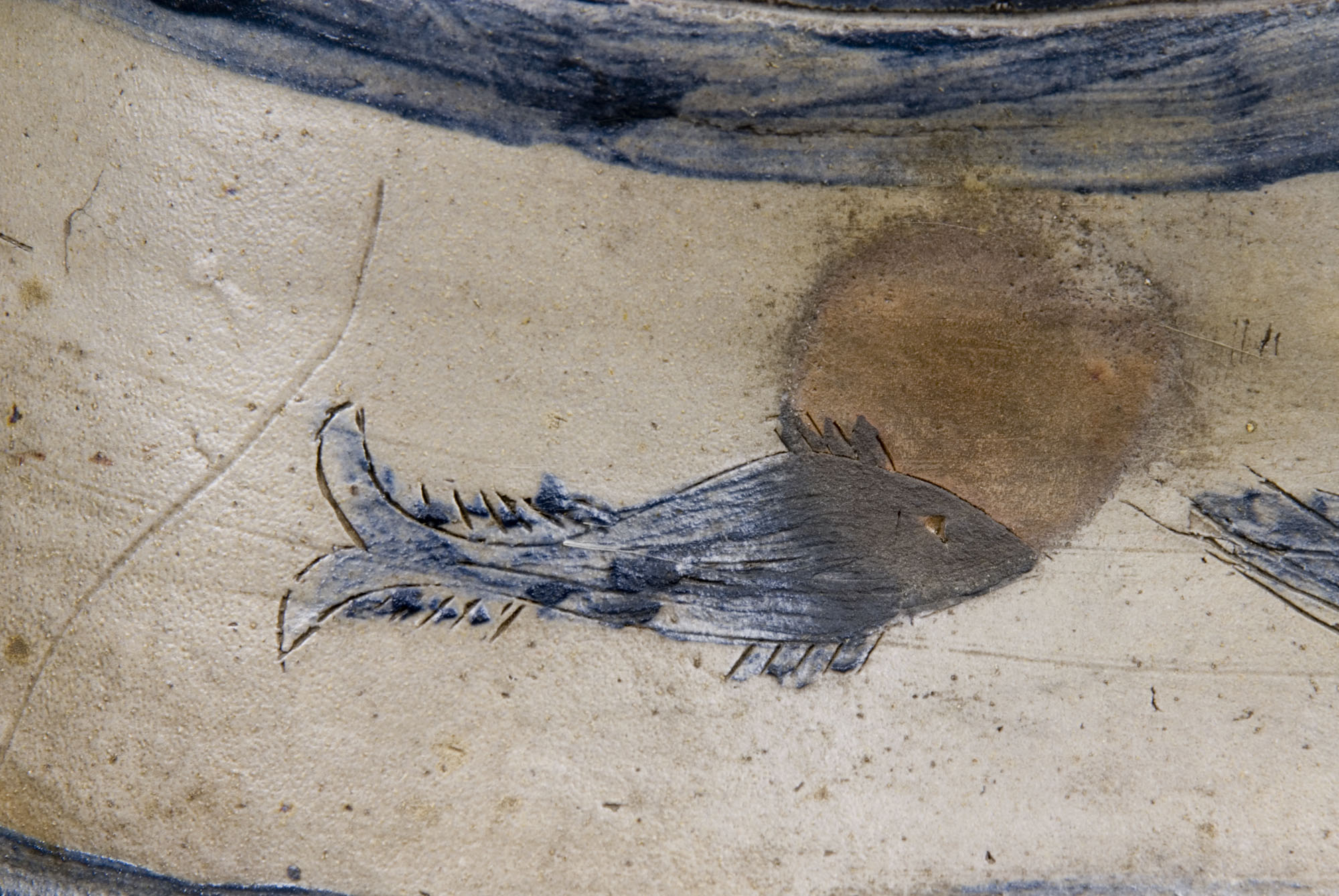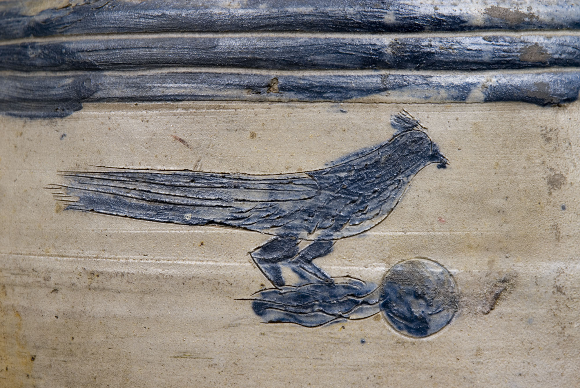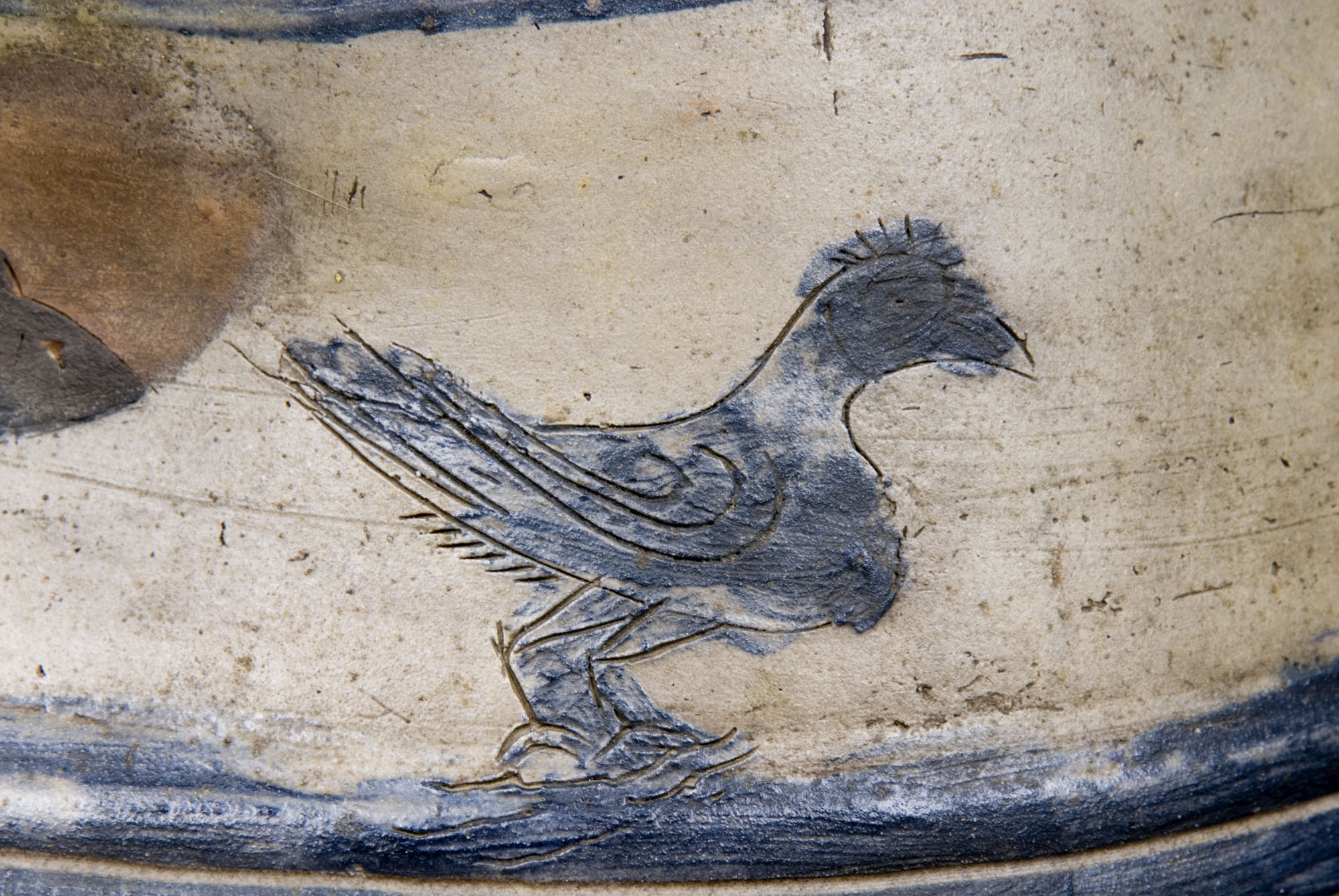 Coolers were designed to dispense liquids from a stationary position, unlike portable jugs and pitchers. A wooden spigot was inserted into the bunghole near the base; that controlled the flow of liquid into a waiting mug or pitcher. Coolers were usually decorated to transform the utilitarian container into an aesthetic attraction. Their broad surfaces also favored incised decoration and cobalt-glaze highlights. This cooler's birds and fish are liberally coated with blue glaze, as are the incised bands that mimic the bands found on wooden kegs. This cooler's top opening is large enough to allow large chunks of ice to be added to cool drinks. Paul Cushman was one of the founders of a regional stoneware industry that spanned the Upper Hudson Valley. When he moved to Albany around 1800, there were few local potters, but his pottery works became a long-lived and successful business that also initiated a century of tremendous growth and expansion in regional stoneware manufacturing.