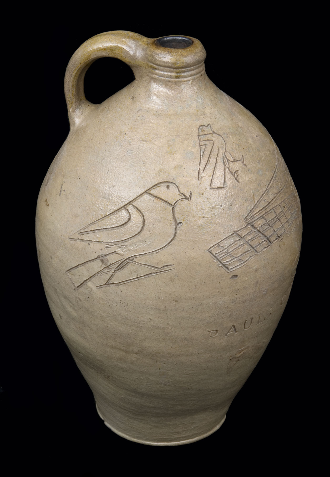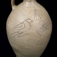 Deeply incised lines compose the three birds that decorate this jug, transforming it from a utilitarian vessel into a delightful work of folk art. The object in the largest bird's beak may be a Prickly Pear cactus or perhaps a winged insect. The other birds are much more stylized in appearance, and their off-center placement suggests they may have been added as an afterthought. Paul Cushman was one of the founders of a regional stoneware industry that spanned the Upper Hudson Valley. When he moved to Albany around 1800, there were few local potters, but his pottery works became a long-lived and successful business that also initiated a century of tremendous growth and expansion in regional stoneware manufacturing.