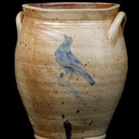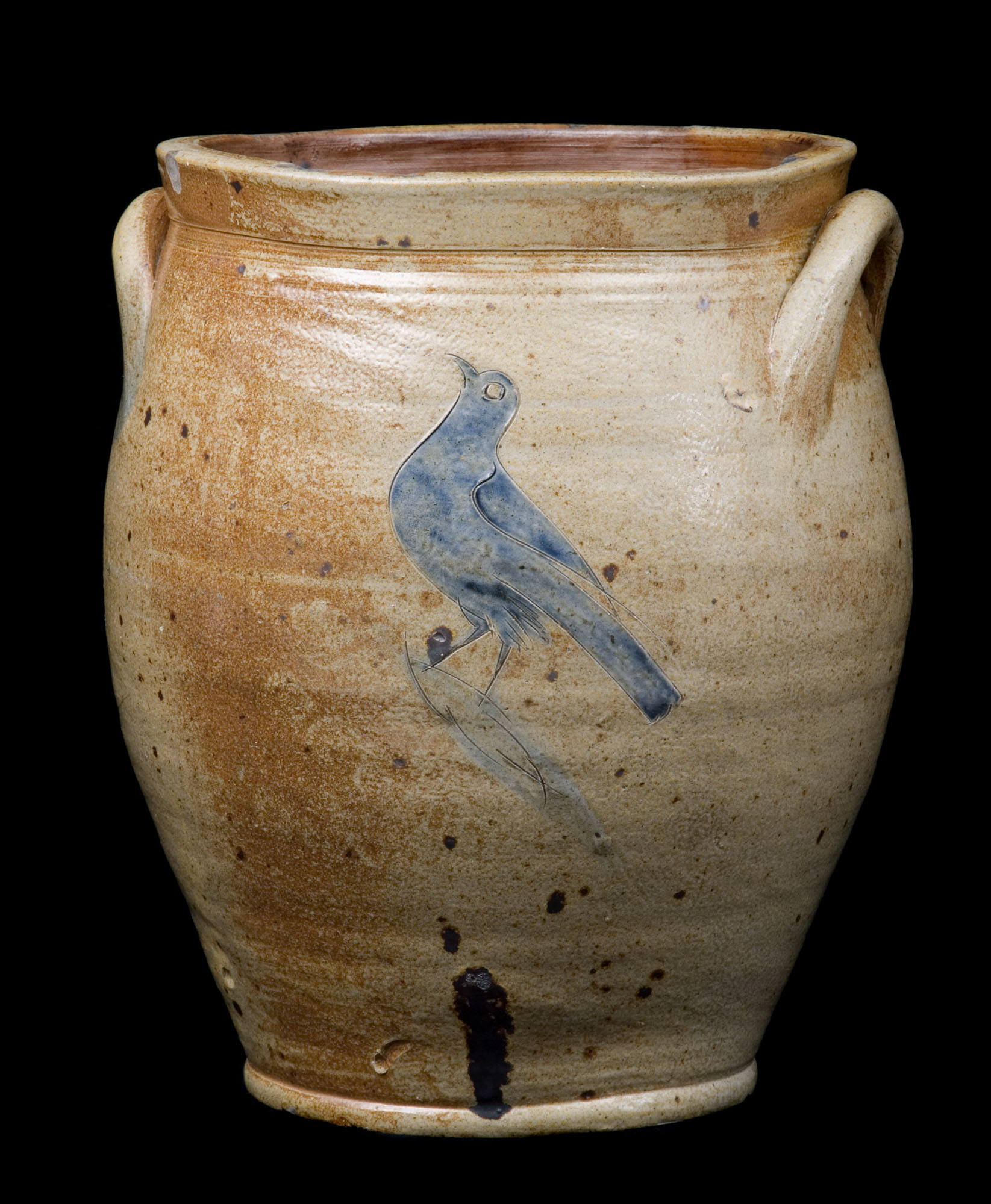 The well-developed songbird on this pot also graces the sides of several other known vessels, as does the flower, although with more variations than the bird. Some flowers look exactly like this example; others more closely resemble daisies. Stoneware with these decorative motifs appears most frequently in the upper Hudson Valley and were probably the products of an Albany potter.