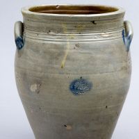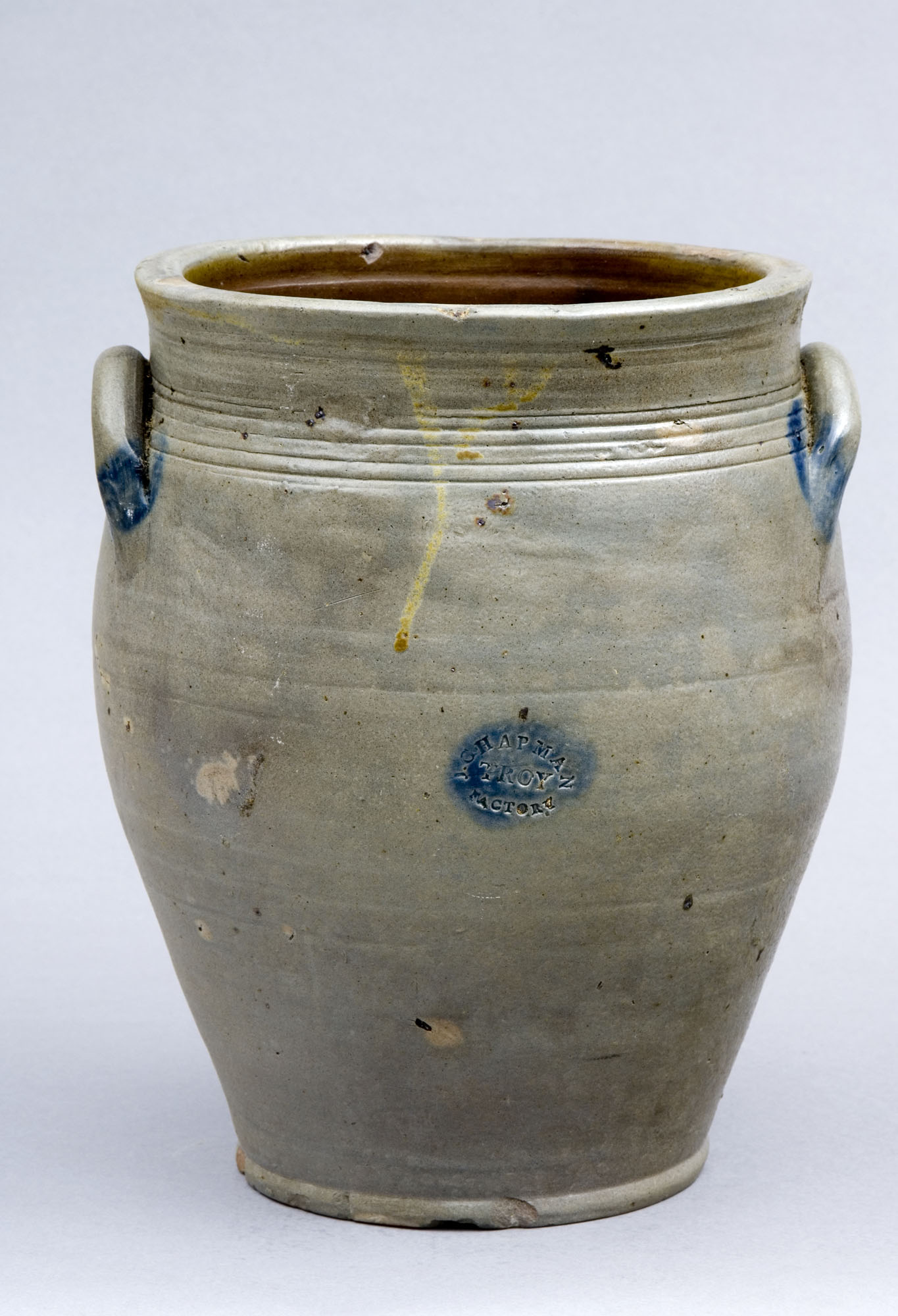 By 1803, Chapman was producing stoneware in Troy, NY, on the opposite bank of the Hudson River from Albany. As one of the region's earliest stoneware potters, Chapman may have seen a potential market for his product since little competition existed. Even though Chapman remained in the pottery business for at least twelve years, very few stoneware vessels marked by him survive. This pot is a striking blue-grey color, indicating it was made using less local clay (which produced brown- and pink-toned vessels) than usual, and was thus of higher quality. The five wavy lines probably represent its capacity (using the lines as an alternative to marking it 5).