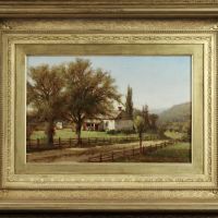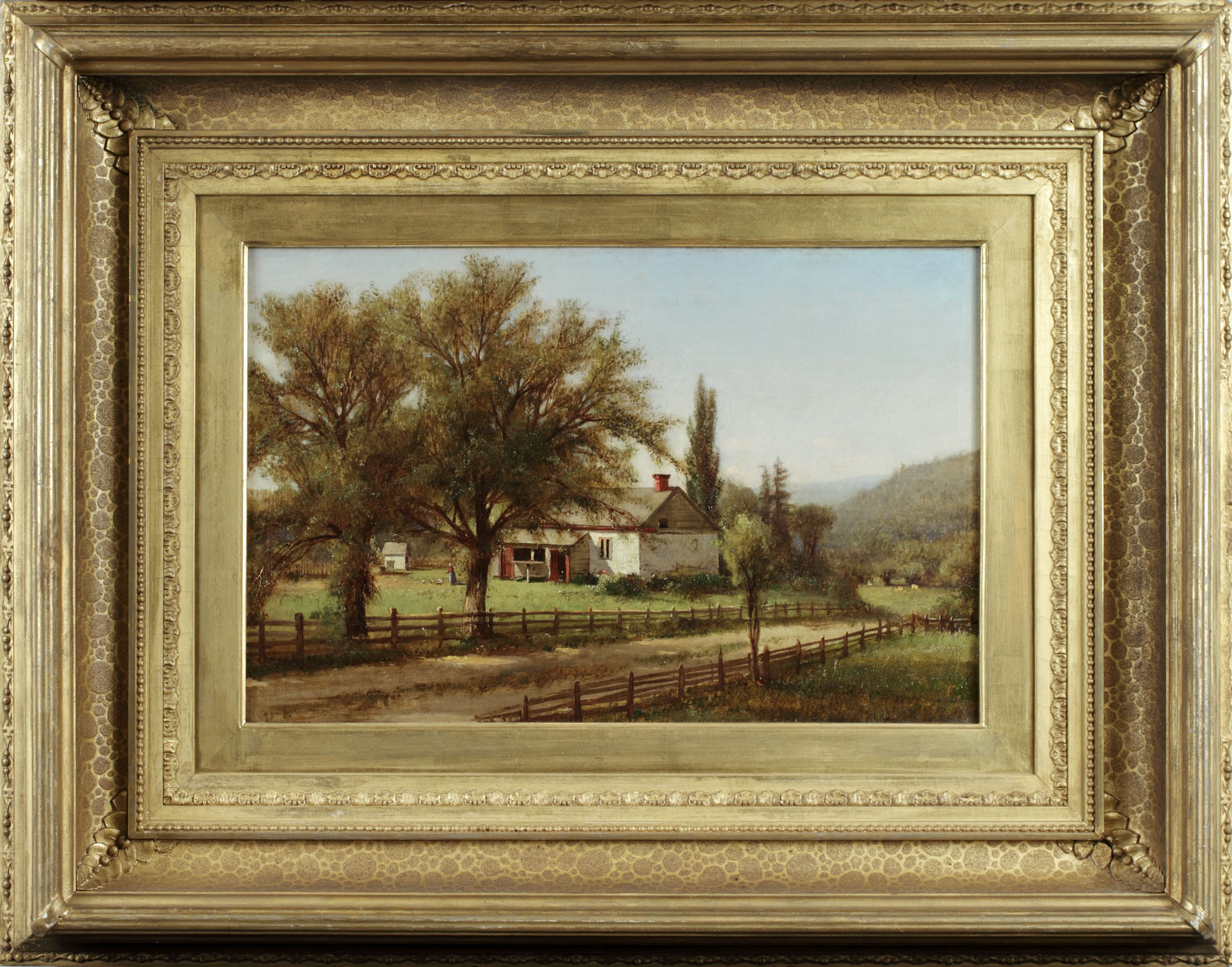 Henry Ferguson’s painting is both a house portrait and a veneration of the old family homestead. By the 1860s and 1870s, American families tended to be less stationary than they had been in earlier generations. The old family homestead become a symbol of the past, a nostalgic reminder of what Americans were losing due to rising urbanization, industrial expansion, and westward migration. The Van Allen homestead painted by Ferguson most likely stood south of Albany in Bethlehem Township, where generations of Van Allens lived and farmed, but the exact homestead has not been identified.