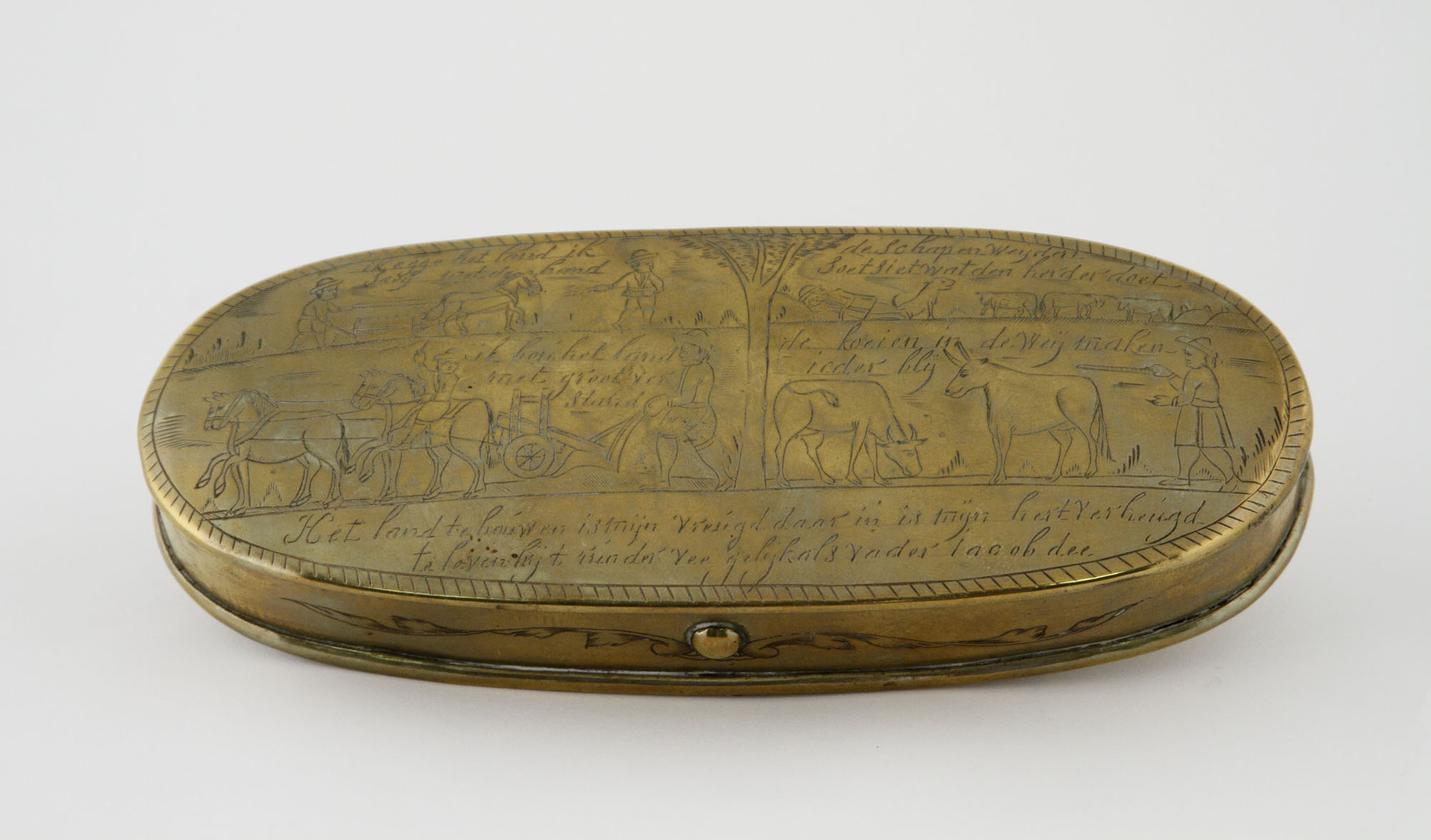 Engraved on surfaces: ikegge het land ik Saen met de hand; de Schaper Weijden Soet Siet watden herder doet; ik bori het land met groot ver stand; de koien in de Weij maken ieder bly; Het land te bouw en isttruijn vreiegd daar in is tuijn hert ver heigd to leven byt trinder vee gelykals vader jacob dee; eerst gedranken; al wat den boer haald rijt den Velde het is voor pagten en angelde als het den freerniet kormt versoeten sal b=de boert veld riijtmoeten.