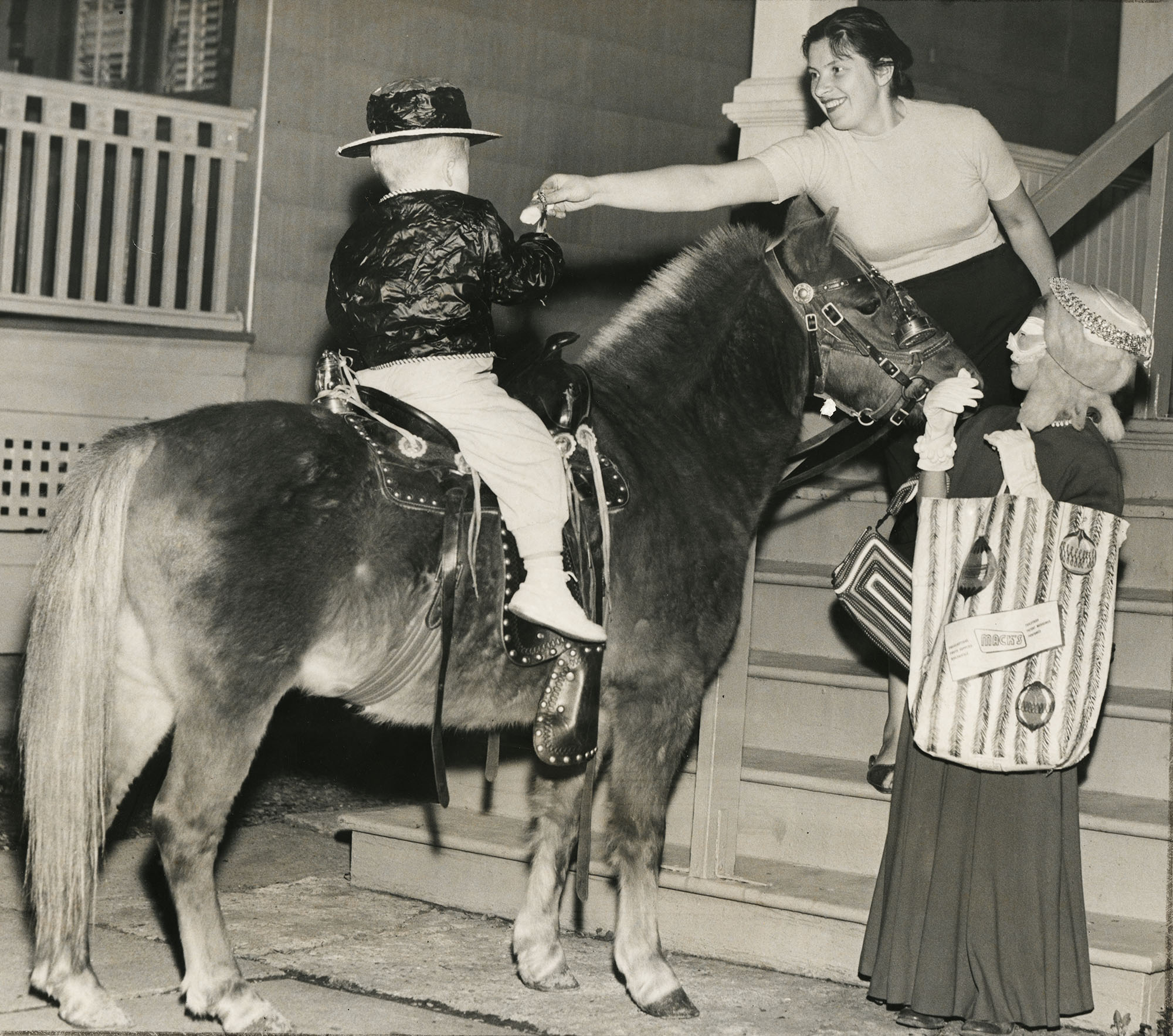 In Pencil on reverse: "Mrs. Rose Zilber of 15 Arcadia Ave in Albany gives candy to 2 ½ year old Sammy Gardiner as the Lone Ranger on his horse Rowdy as Donald Geisel looks on."