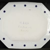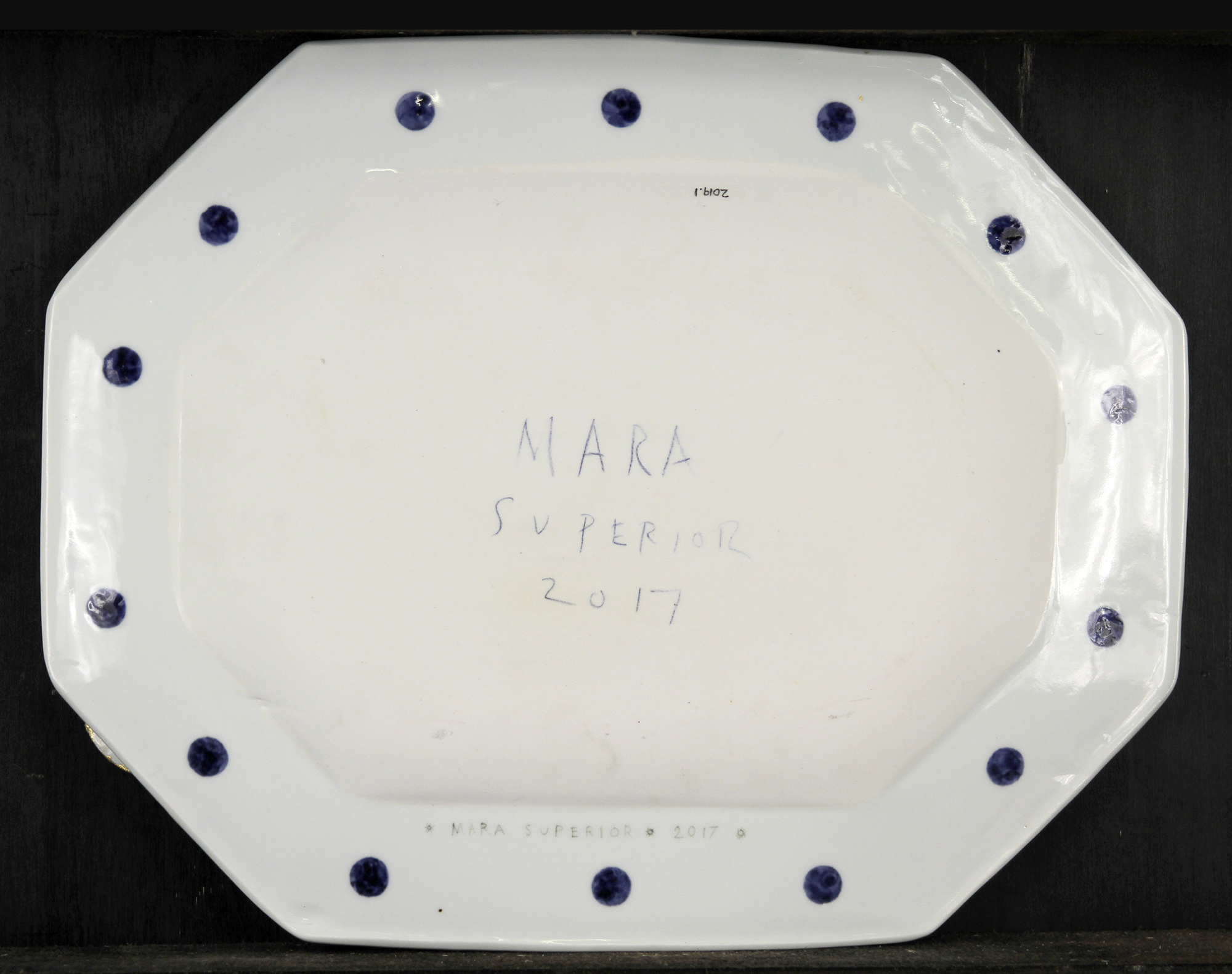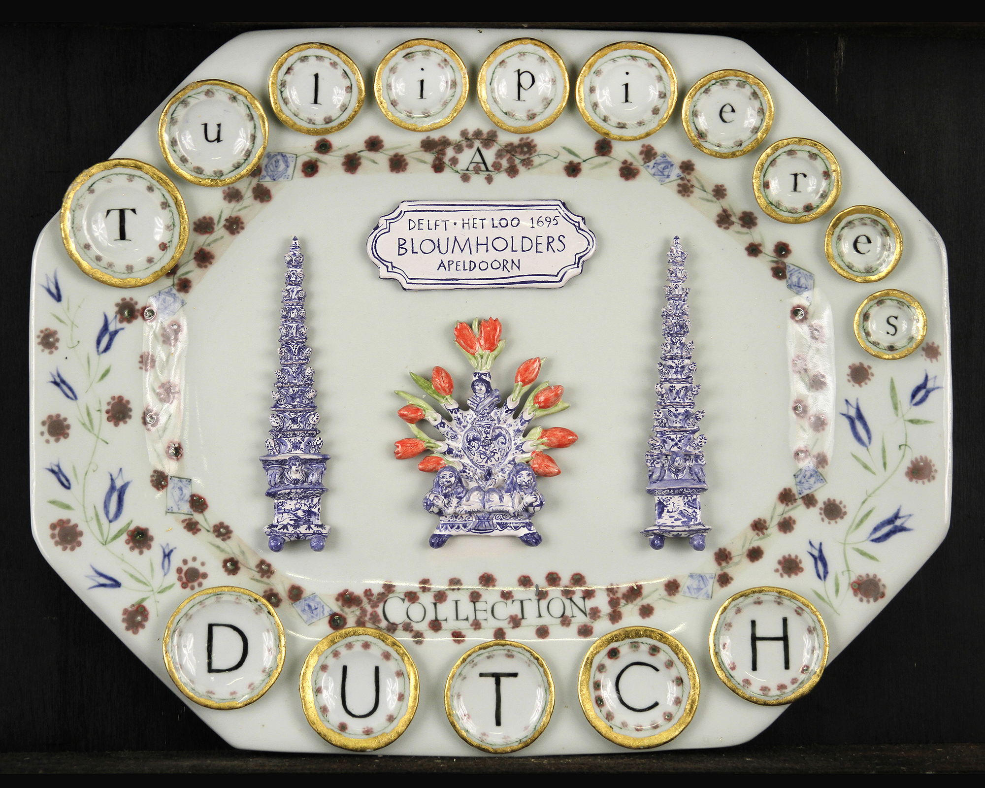 Mara Superior is a nationally recognized visual artist who works in porcelain. Her love of history and the decorative arts is apparent in many of her ceramic works, including Tulipieres: A Collection of Tulipiere Vases. This platter displays Dutch tulipieres vases made of blue cobalt-decorated earthenware (commonly called Delftware). The center vase displays red tulips while the two tall vases on either side are empty. Since the early seventeenth century the Dutch have cultivated tulips and flower bulbs for which they are still known and admired.