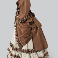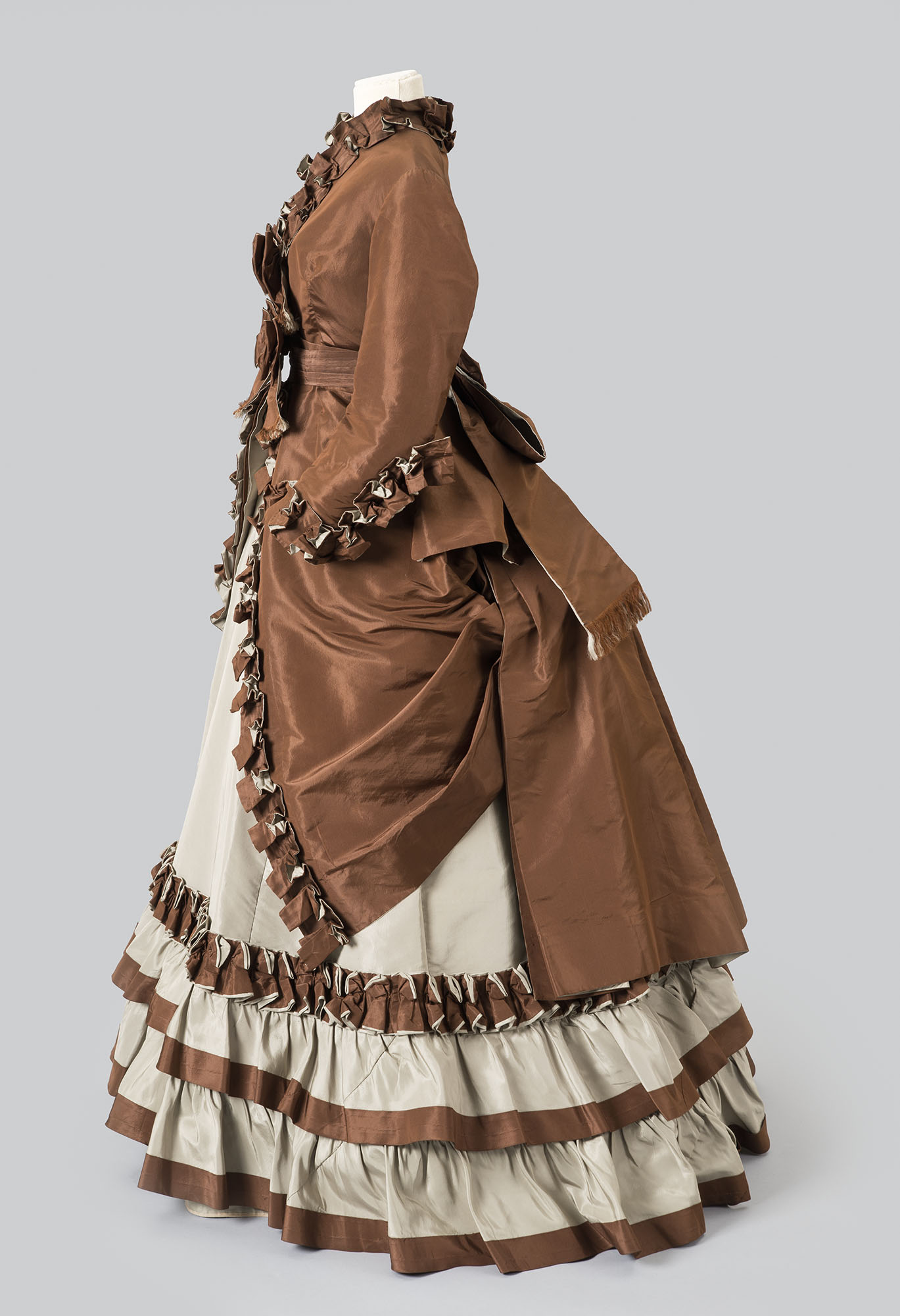 This suit was made by the house of Charles Frederick Worth, the ultimate arbiter of international fashion in the second half of the nineteenth century. He was also the man who established the concept of French haute couture. His firm, Worth & Bobergh, was the first to show seasonal collections, and to label their clothing. He applied the principles of the industrial revolution to dressmaking, developing a system of interchangeable components so his staff could turnout variations of garments from each collection without having to create an entirely different gown for each customer. Fashion-conscious women such as Mrs. Edwin Weld Corning, who owned this dress, subscribed to Balzac's notion that only those who visit Paris can achieve true elegance.