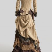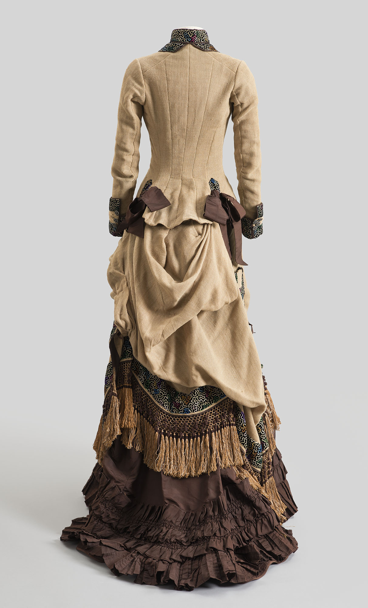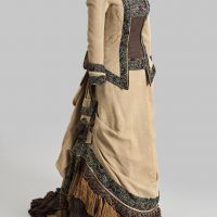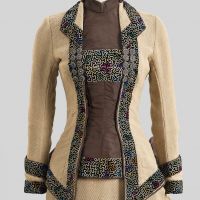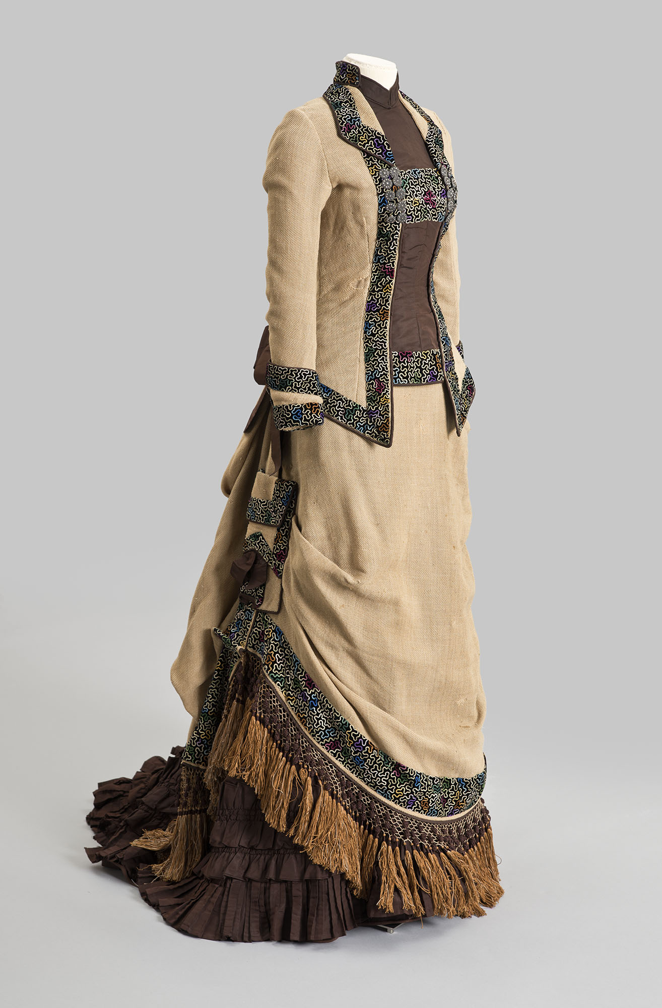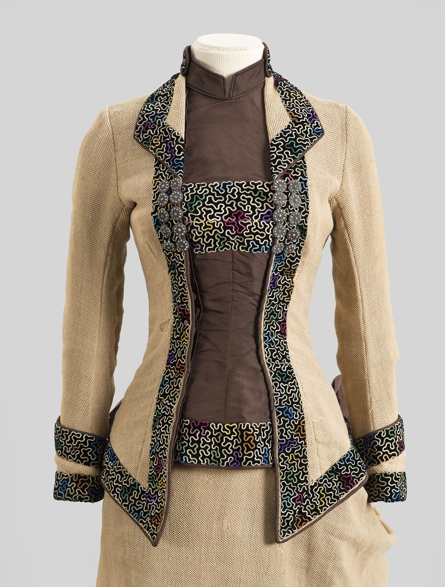Wool novelty weave fabric, silk taffeta, cotton velvet, silk fringe and trim