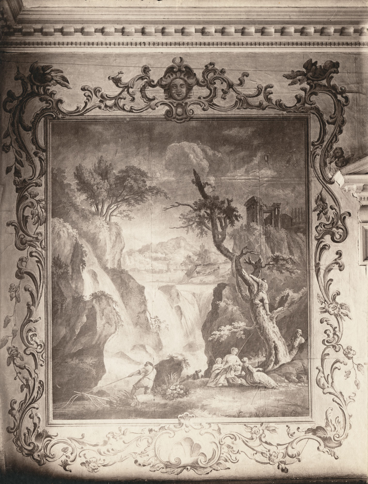 Inscribed in pencil on reverse: 25B/17C. V-B-22. Rubber stamped on reverse: Albany Institute of History and Art. Inscribed in ink on label, glued to card reverse: V9, Van Rensselaer Manor House, Wall-paper- Water, AW Floyd, Gift of Subscribers, March 10,1903. (Negative)